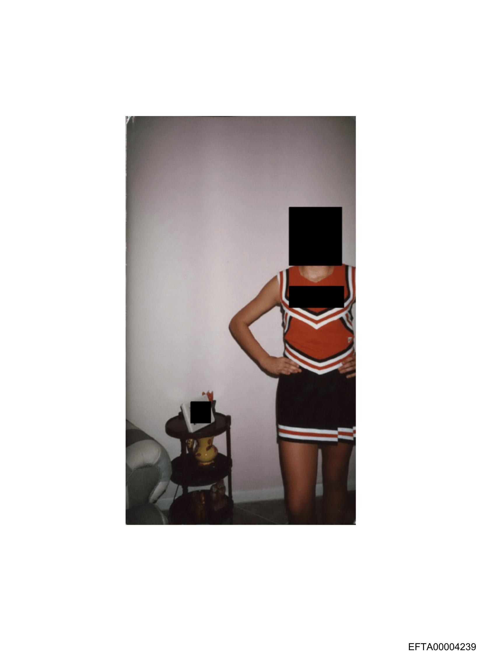 The image appears to be an old photograph with a vintage quality. The central figure is a person standing indoors, wearing a red and white striped dress that resembles a cheerleader's uniform. They are facing the camera and their head is not visible in the frame, as it has been intentionally obscured by what seems like a digital manipulation. In the foreground on the left side of the image, there is an object that appears to be a small figurine or toy placed on a surface, but due to the angle and focus, it's difficult to discern more details about this item. The background features a plain wall with a light shade, adding to the casual indoor setting of the photo. There are no visible texts in the image, and the only location indicated is the interior space where the photograph was taken.