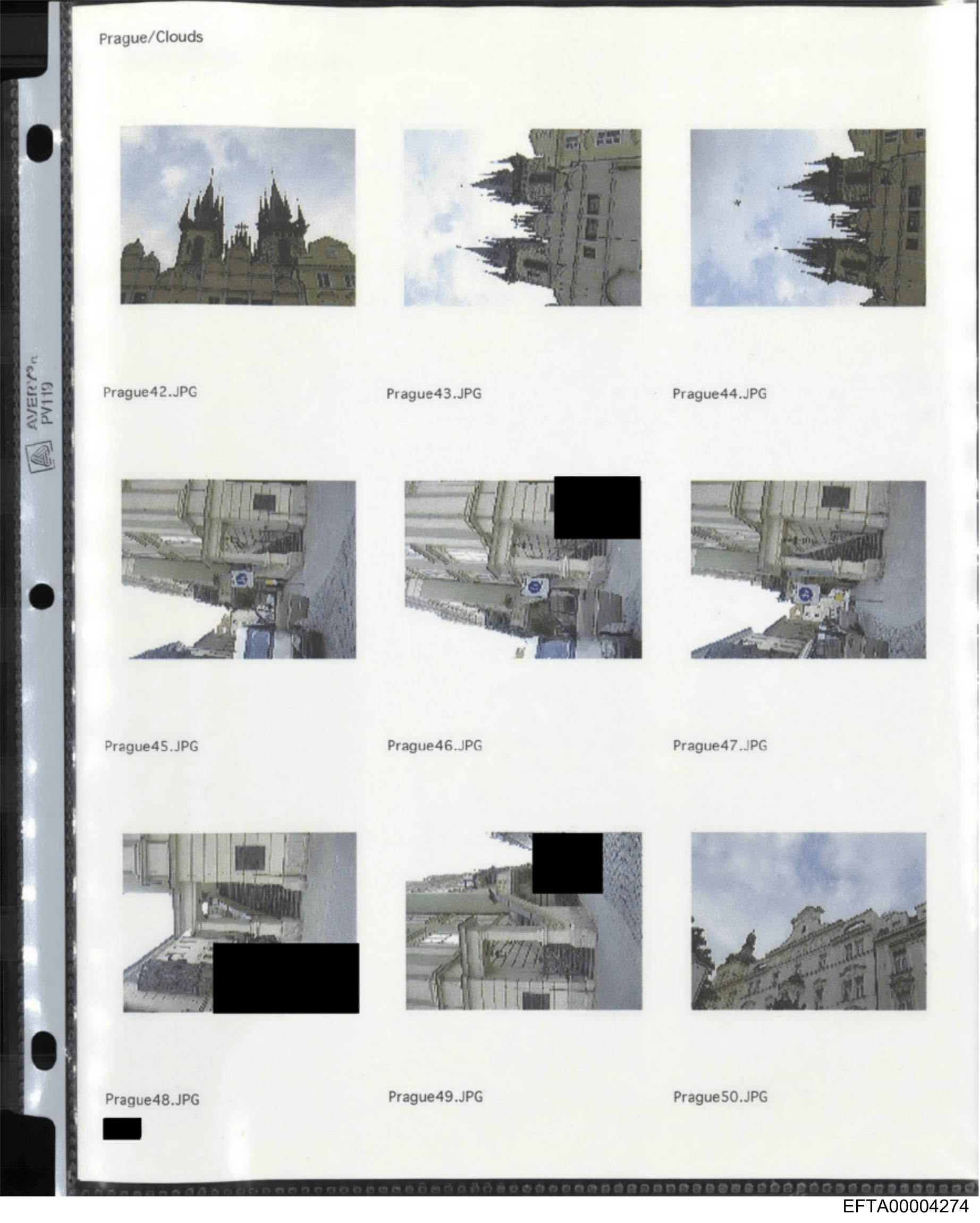 The image is of a physical photo strip with three separate photographs arranged vertically on what appears to be a transparent plastic sheet with hole punch marks for organizing and storing photos. The topmost photograph shows a cathedral-like structure in the background under blue skies, suggesting an outdoor scene. The middle photograph depicts a close-up view of a building facade or architectural detail, which is out of focus due to the camera's depth of field. The bottom photograph features another architectural element, possibly part of a window or balcony railing, with similar shallow depth of field blurring the details in the foreground. There is no visible text on the photographs themselves, and there are no people present within the depicted scenes.