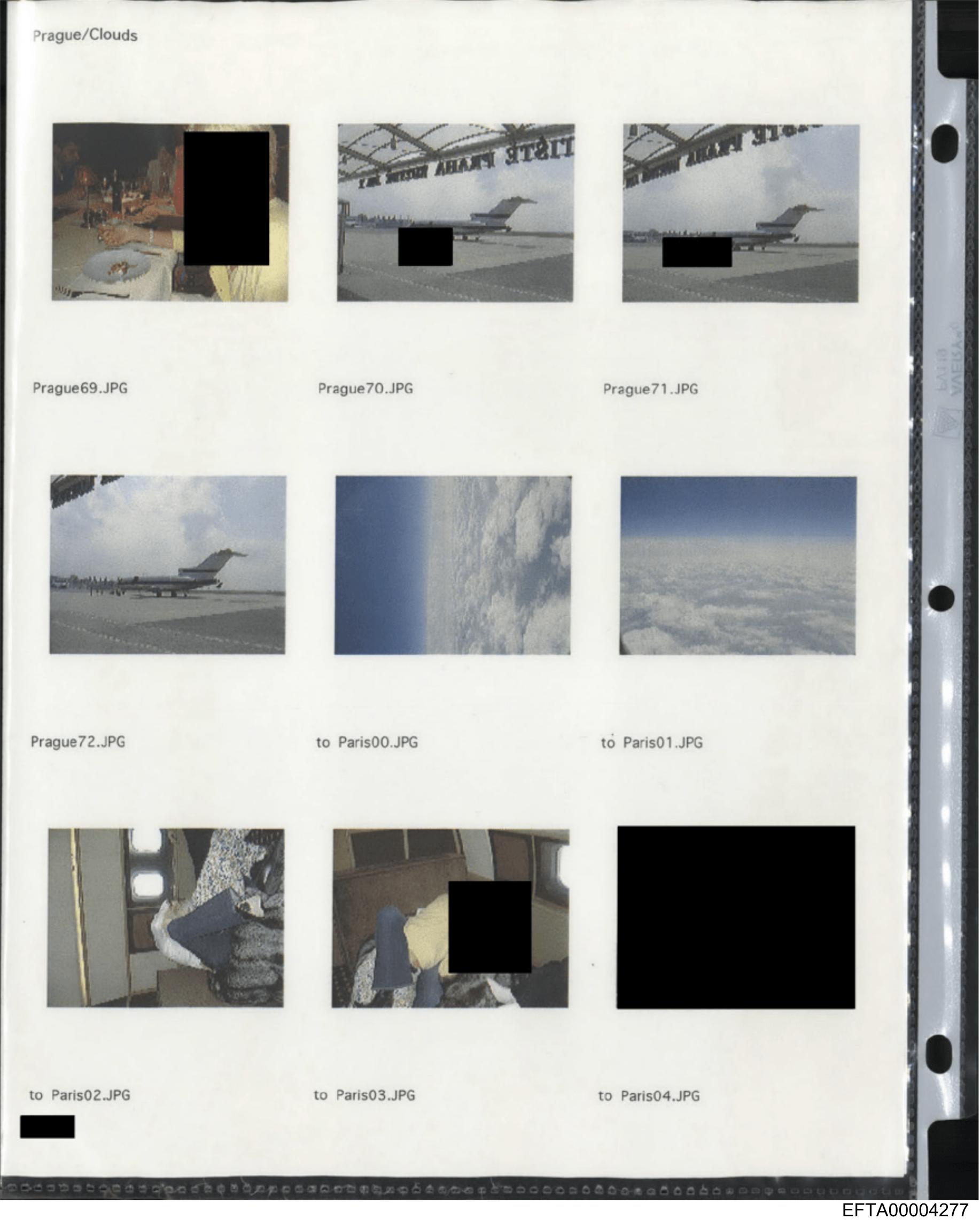 The image shows a collection of photographs displayed on what appears to be a presentation slide or a printed document with an overlaid layout grid for organizing the content. The photos depict various scenes: one features a person standing outdoors, another is of an airplane wing and engine, and others show aerial views of clouds and landscapes during different times of day. There are also images that are obscured by red X marks, indicating they should not be viewed or have been removed for some reason. The layout grid includes labels such as "PAGE" followed by numbers 1 to 6, suggesting the order in which these photographs are intended to be presented. Additionally, there is a section at the bottom labeled "PROJECT," but the text within it is not clearly legible. The style of the image suggests an educational or professional context where visual materials are being organized and possibly discussed.