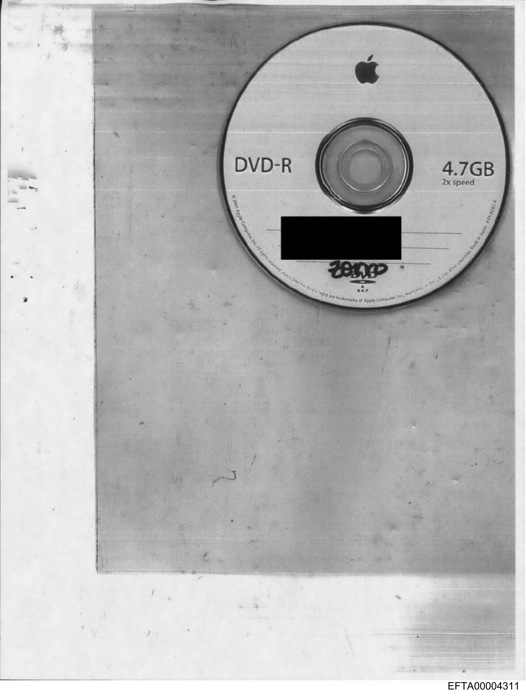 The image is a low-resolution photograph of a DVD disc with various texts and symbols printed on it. At the center, there's a logo that appears to be for Apple, indicating it might be an official product from that company. The text "DVD R" suggests that this is a recordable DVD format designed primarily for playback in standard home DVD players and computer drives. Additionally, the text "4.7 GB 120 min" provides information about the disc's capacity: 4.7 gigabytes of data storage, equivalent to approximately 120 minutes of video content at typical standard definition quality levels. The overall appearance of the image is somewhat grainy and faded, which may be due to the quality of the original photo or the condition of the DVD itself.