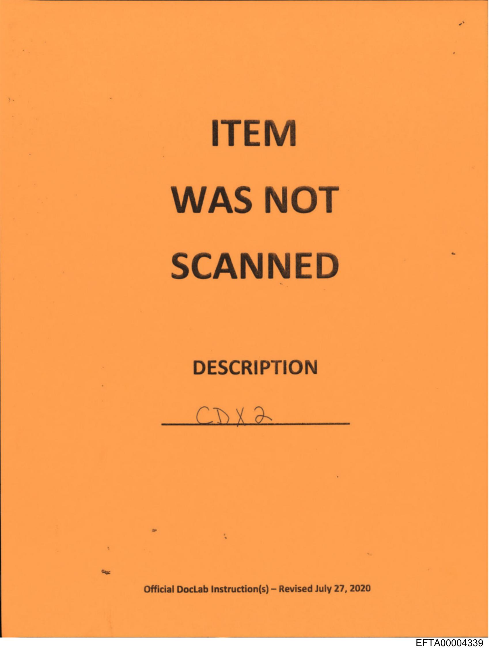 The image shows an orange paper with printed and handwritten text on it. The printed text at the top reads "ITEM WAS NOT SCANNED" in bold letters, indicating that whatever item this form is related to has not been scanned through a system, possibly for inventory or security purposes. Below this, there's a line where additional information can be written; however, only the initials "CJ" are visible on the handwritten part of the text. At the bottom of the paper, there is more printed text which includes the words "OFFICIAL DOCUMENT INSTRUCTIONS" and "RECEIVED MAY 17, 2009," suggesting that this form was received as an official document on May 17th in a year that appears to be 2009. The overall condition of the paper suggests it's been handled or used previously, with visible wear and creases.