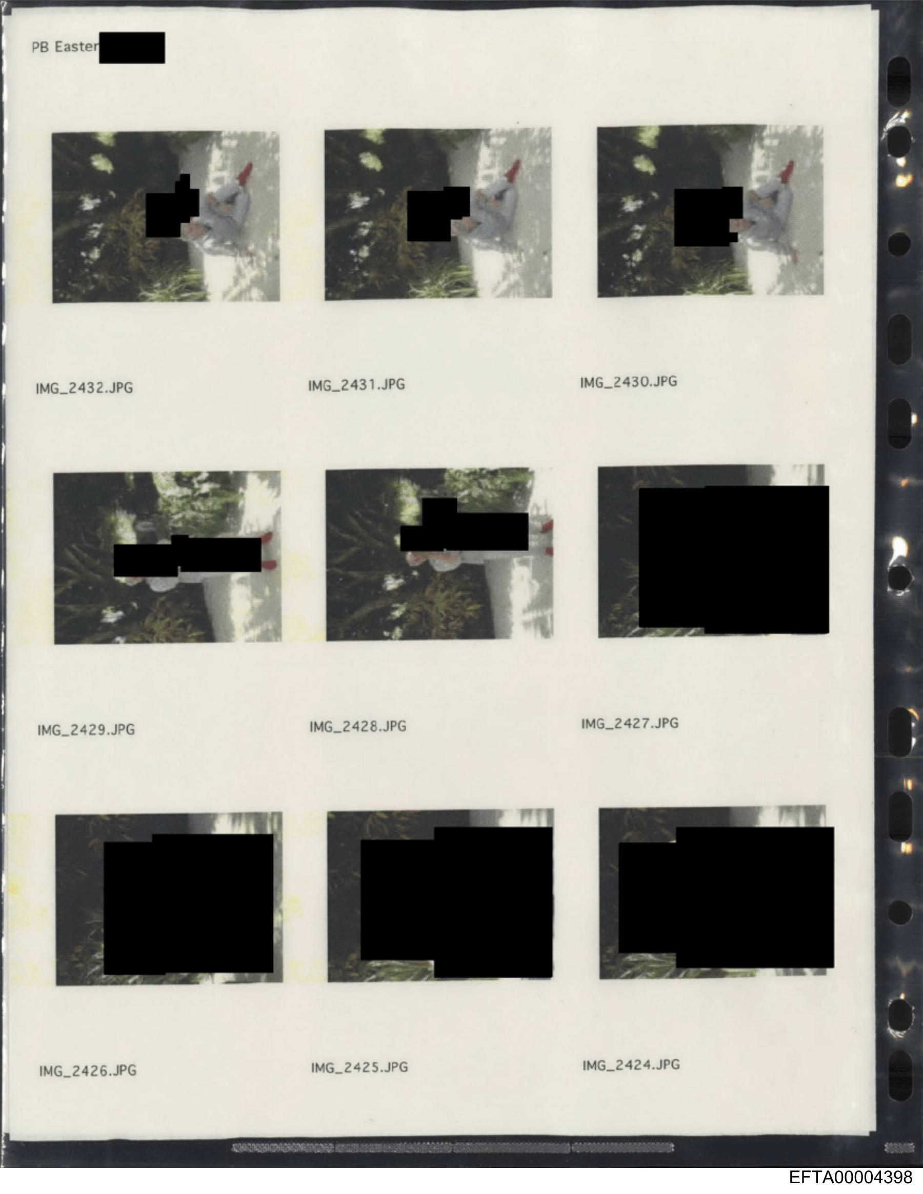 The image displays a collection of six smaller photographs arranged in two columns on what appears to be an envelope or sheet. Each photograph has been altered by having a large black "X" drawn over it, obscuring the content within. In addition to the photos, there is text present on the top left and right corners, but the details are not clear enough to read accurately. The text could potentially contain dates or other information related to the images. The style of the image suggests it may be a physical photograph or scan that has been marked up manually with the black "X"s.