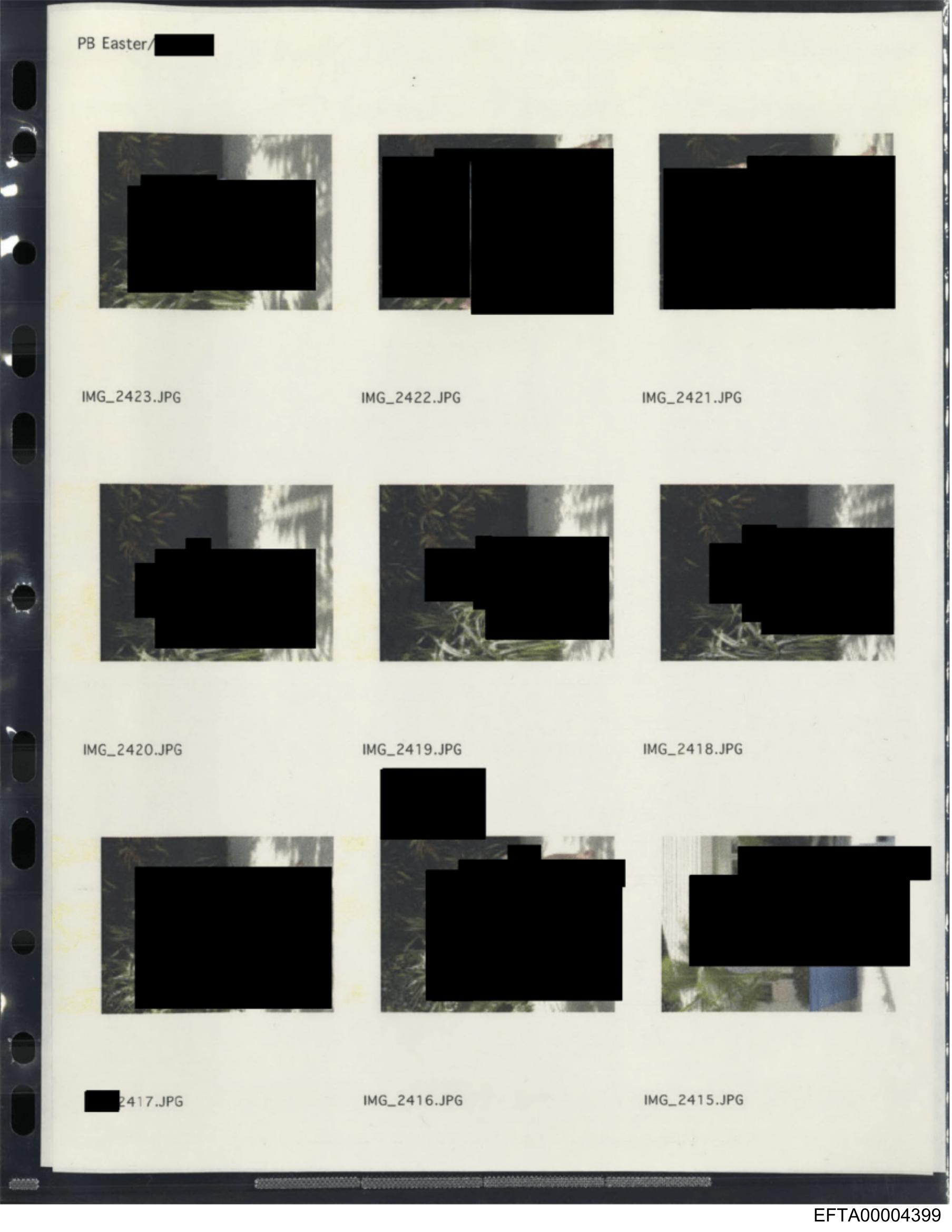 The image shows a page of photographic prints with eight frames, each containing an altered or obscured photograph due to redacted or blackened areas covering the central parts of the images.