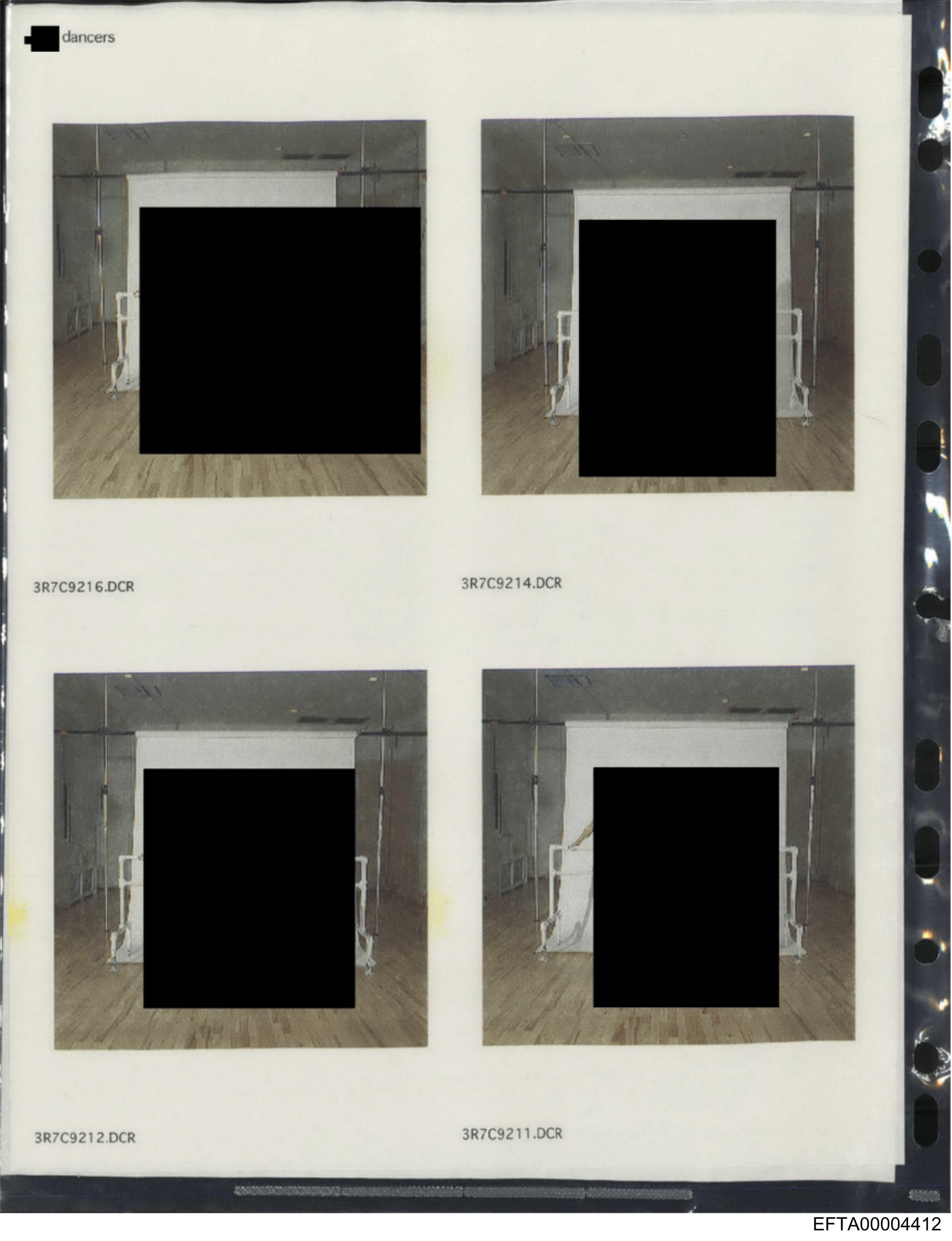 This image shows a sequence of three photographs arranged vertically, likely demonstrating the progression of an event or process. Each photo has areas obscured by large black rectangles with white borders and the word "EXAMPLE" written in the center. The visible parts of the images suggest that they might be taken from a surveillance camera or similar monitoring system due to their uniform framing and perspective. In the first picture at the top, we can see a partial view of what appears to be an interior space with white walls, possibly indicating the start of a situation being monitored. The second photo shows more of the same environment, but with the central black rectangle covering the details that might have changed since the previous image. The third and final visible image at the bottom gives us an even clearer look at the room's structure but continues to hide important information behind the black rectangles. The overall context remains ambiguous due to the intentional concealment of key elements within each photograph.