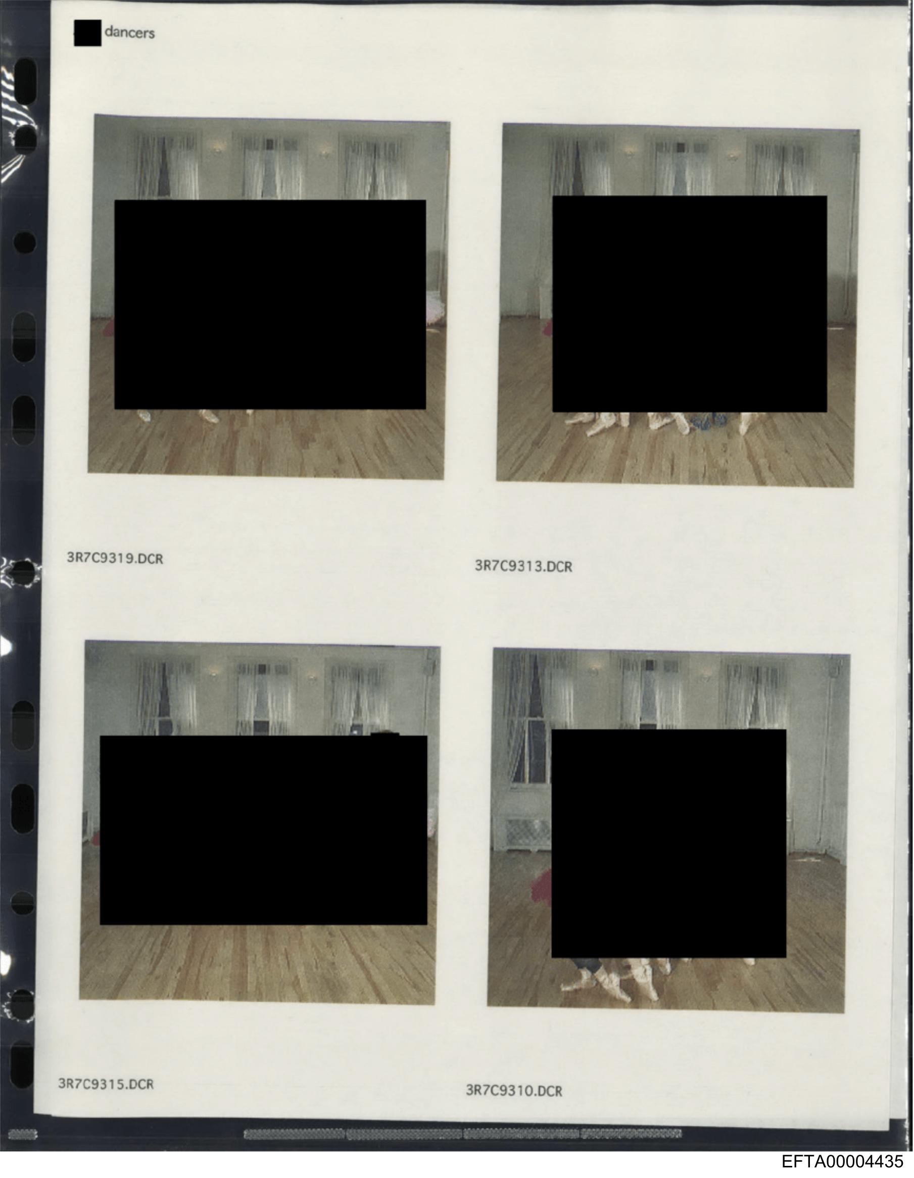 This is a photograph of four photographs arranged vertically on what appears to be photo strips typically found in film photography. The style suggests these are analog photos from an older era of imaging technology. Each individual picture shows the same interior room with wooden flooring, and at least one person seems to be present, though their body or face is obscured by a red mark that likely represents a censor. These marks suggest that sensitive content was intentionally hidden. The text overlaying each strip includes dates and possibly other information related to the photographs, but the specific details are not entirely clear from this angle.