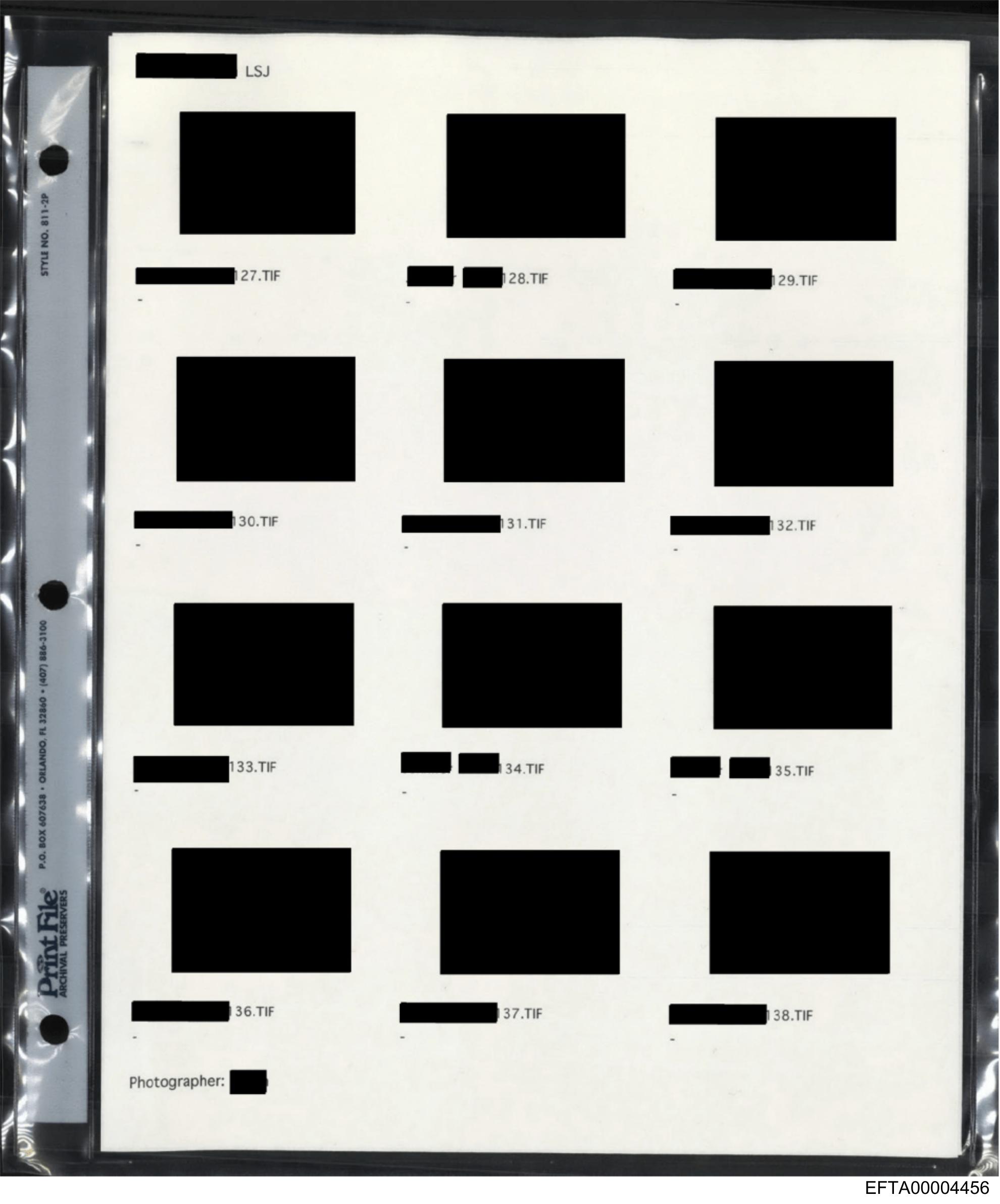 The image shows a piece of paper with several black rectangles on it. These rectangles appear to be placed over parts of the original document to obscure certain information. The paper has printed text at the bottom, which includes what looks like dates and possibly times or names. It is not possible to determine the exact content or context of the original document due to the redactions. The top left corner of the image reveals a part of another document with text on it, but most of this text is obscured by the paper in front.