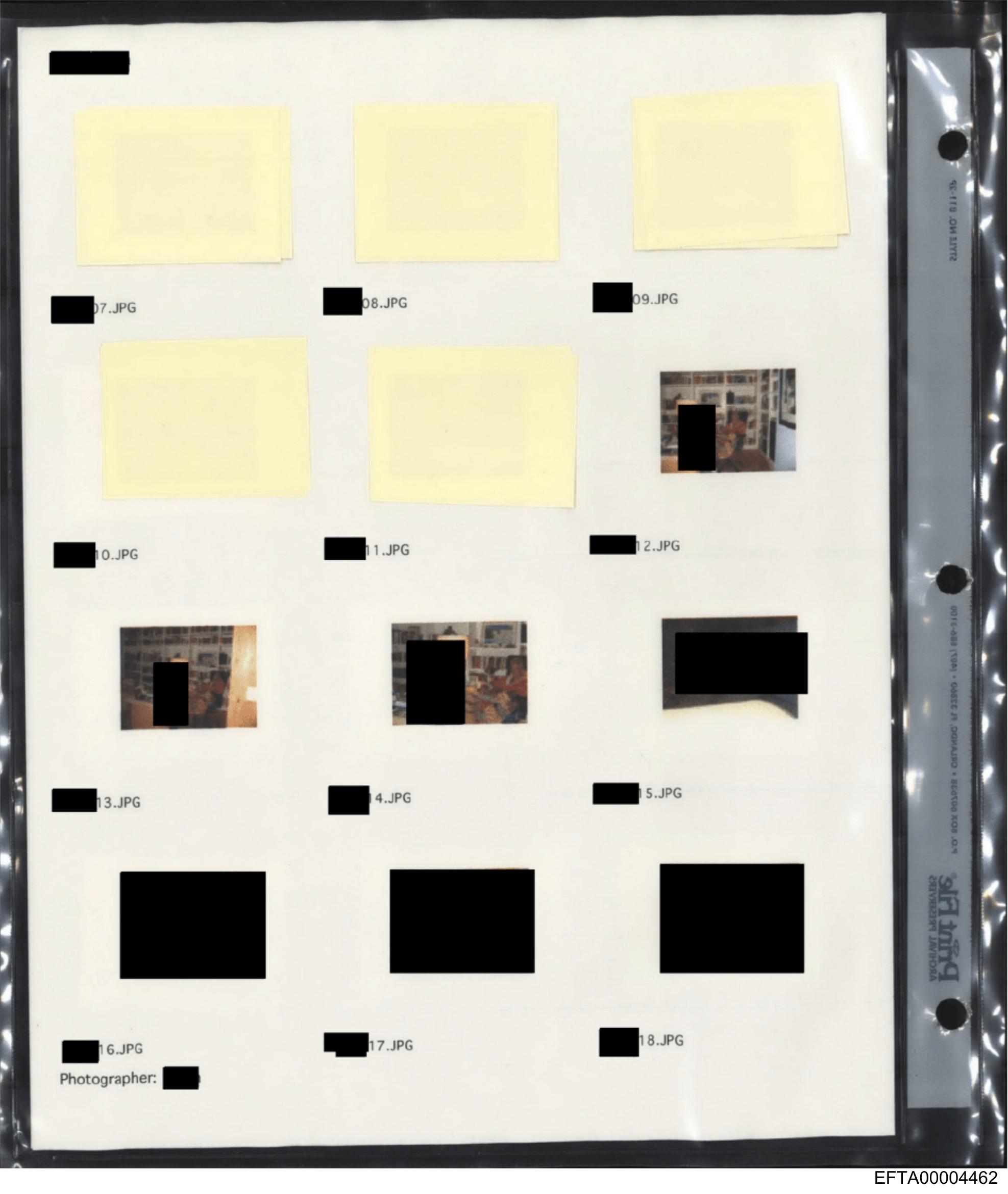 The image shows a collection of eight photographs placed on what appears to be a transparent sheet with numbered tabs at the bottom edge. Each photograph is a different size and orientation but all are contained within a consistent rectangular frame. The photographs depict various indoor scenes, including people sitting at desks, rooms with furniture, and items that might suggest an office or educational setting. However, due to the low resolution of the image, specific details such as facial expressions, text on signs, or precise locations are not clearly discernible.