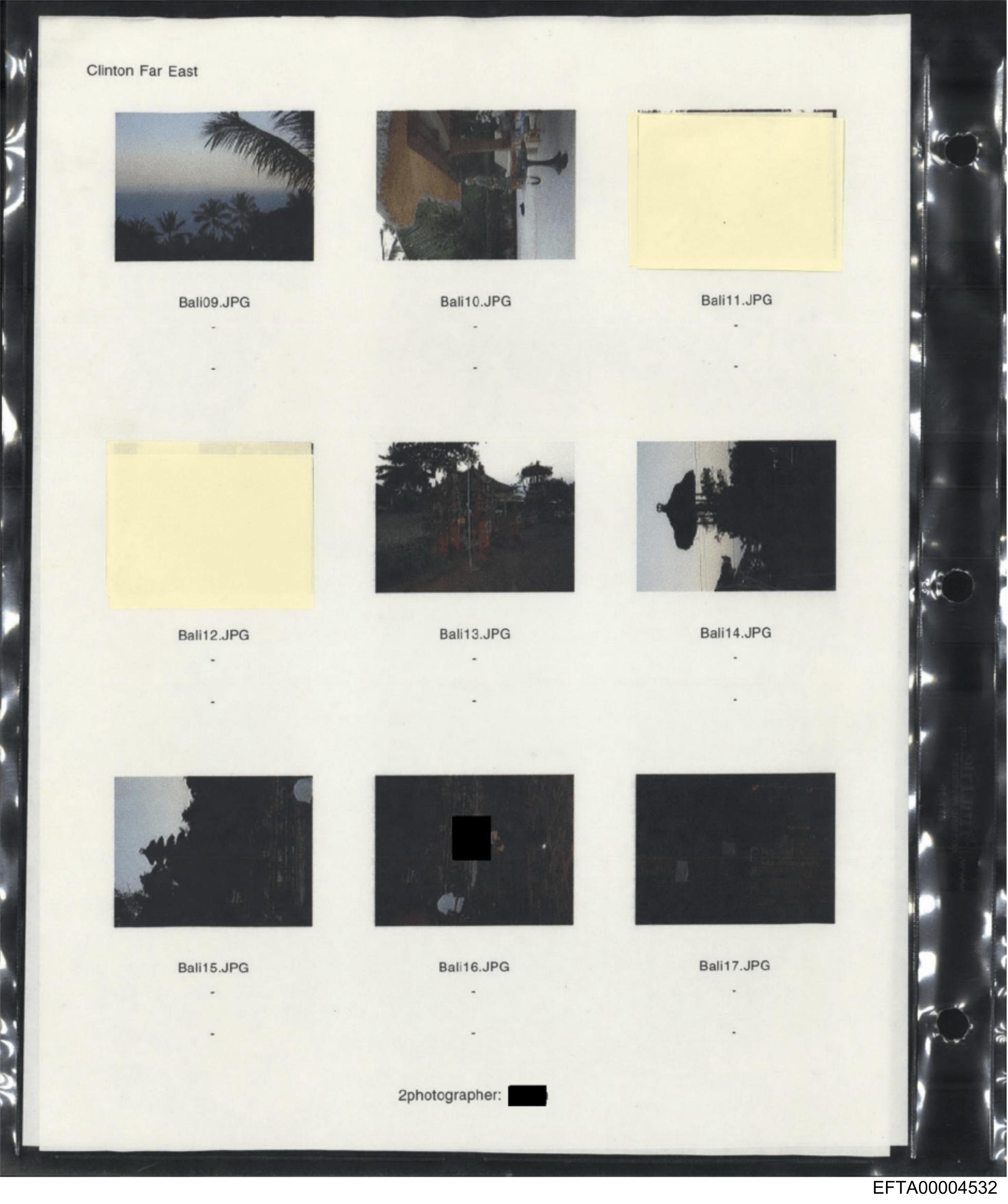 The image displays a piece of paper that appears to be an annotated photo strip, possibly from a vintage camera. It includes six small photos arranged in two columns of three rows each. Each photo is labeled with different numbers and text descriptions such as "Demonstrations" and "Bali." The images show various scenes including what looks like urban settings or demonstrations, with buildings and trees visible. There's also a mark indicating that the fourth photo may be damaged or important as it is circled in red.