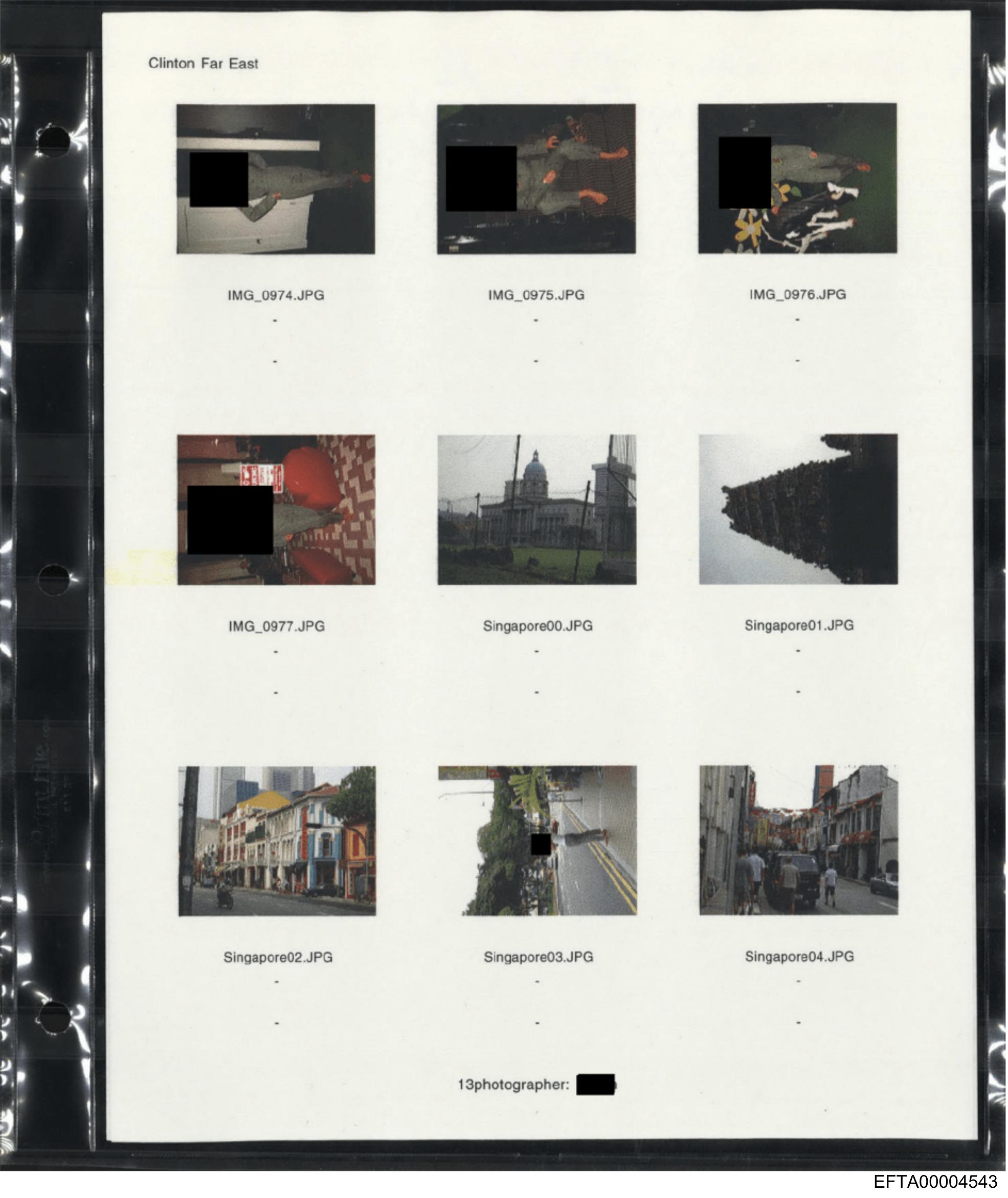 The image shows a collection of photographs taped to what appears to be a piece of paper with a plastic sheet overlaying it. The photos depict various scenes and subjects, including street views, architecture, and possibly urban landscapes. Each photograph has text on the top left corner that seems to indicate its location or description, such as "Singapore" and "Tokyo." The quality and focus of the images vary, with some being more blurred than others. There are no people identifiable in this image.