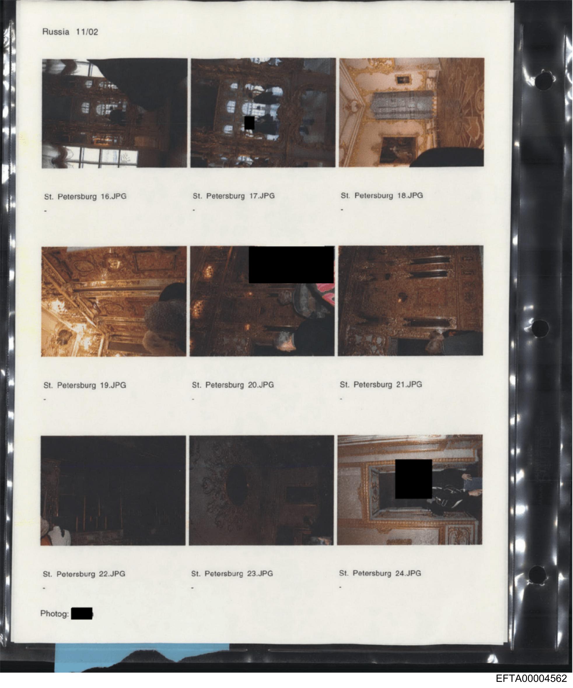 This is an album of photographs with handwritten captions, likely from a vacation or tour. The images show various indoor scenes with architectural details and historical significance. Each photograph has a black mark over the face area where people are present, suggesting privacy concerns or possibly that the individuals pictured do not wish to be identified. The text on the photos includes labels like "PALACE" and "CHURCH," indicating the type of building featured in each picture. The overall quality of the photos suggests they were taken with older photographic technology, as evidenced by the graininess and color saturation.