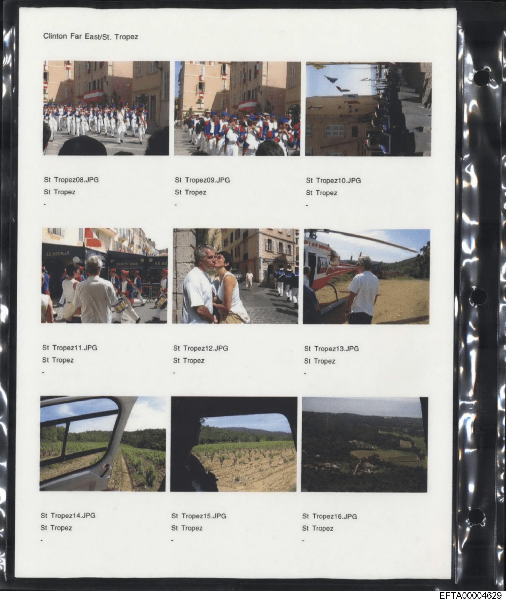 This is a photograph album page showcasing various images. Each picture has a label above it with the numbers "19," "20," and so on, suggesting these are part of a sequence. The photographs depict different scenes including a military band performing outdoors under blue skies, a man walking through what appears to be an agricultural area with rows of plants, and another image featuring an emergency vehicle parked in front of a building. There is also an image of a man sitting next to a vehicle with a camouflage pattern on its hood. The overall quality of the images suggests they were taken during daylight under natural lighting conditions.