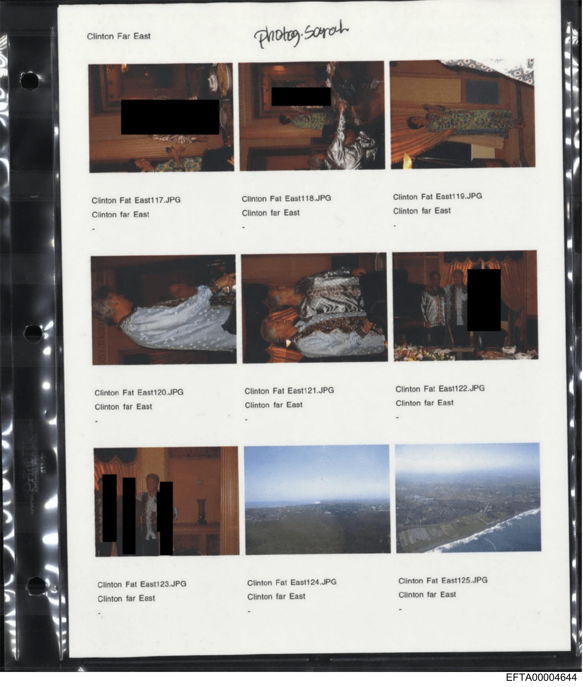 The image shows a collection of photographs pasted onto a binder page with handwritten captions and dates beneath each picture.