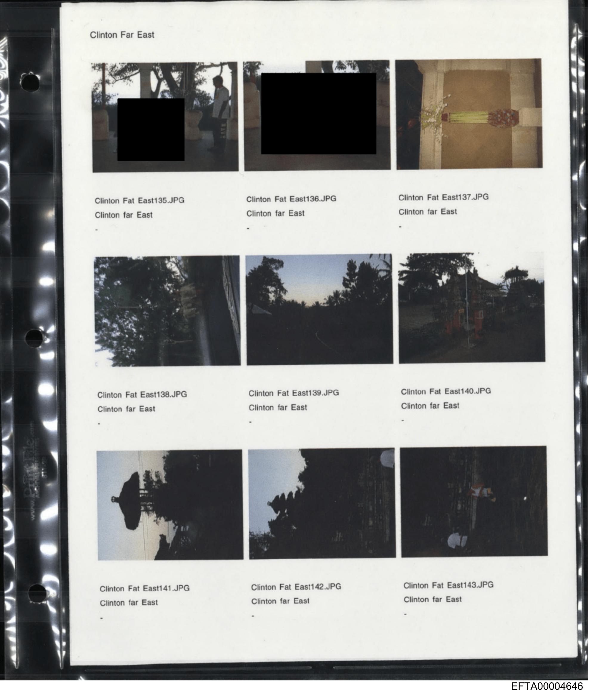 The image shows a piece of paper with a series of photographs attached to it by clear tape. Each photograph is labeled with what appears to be the name "Clinton" followed by various other names and numbers that might indicate dates, file names, or identification codes. The photos themselves are dark and indistinct, making it difficult to discern specific details. There's no text in the image beyond these labels on each photo.