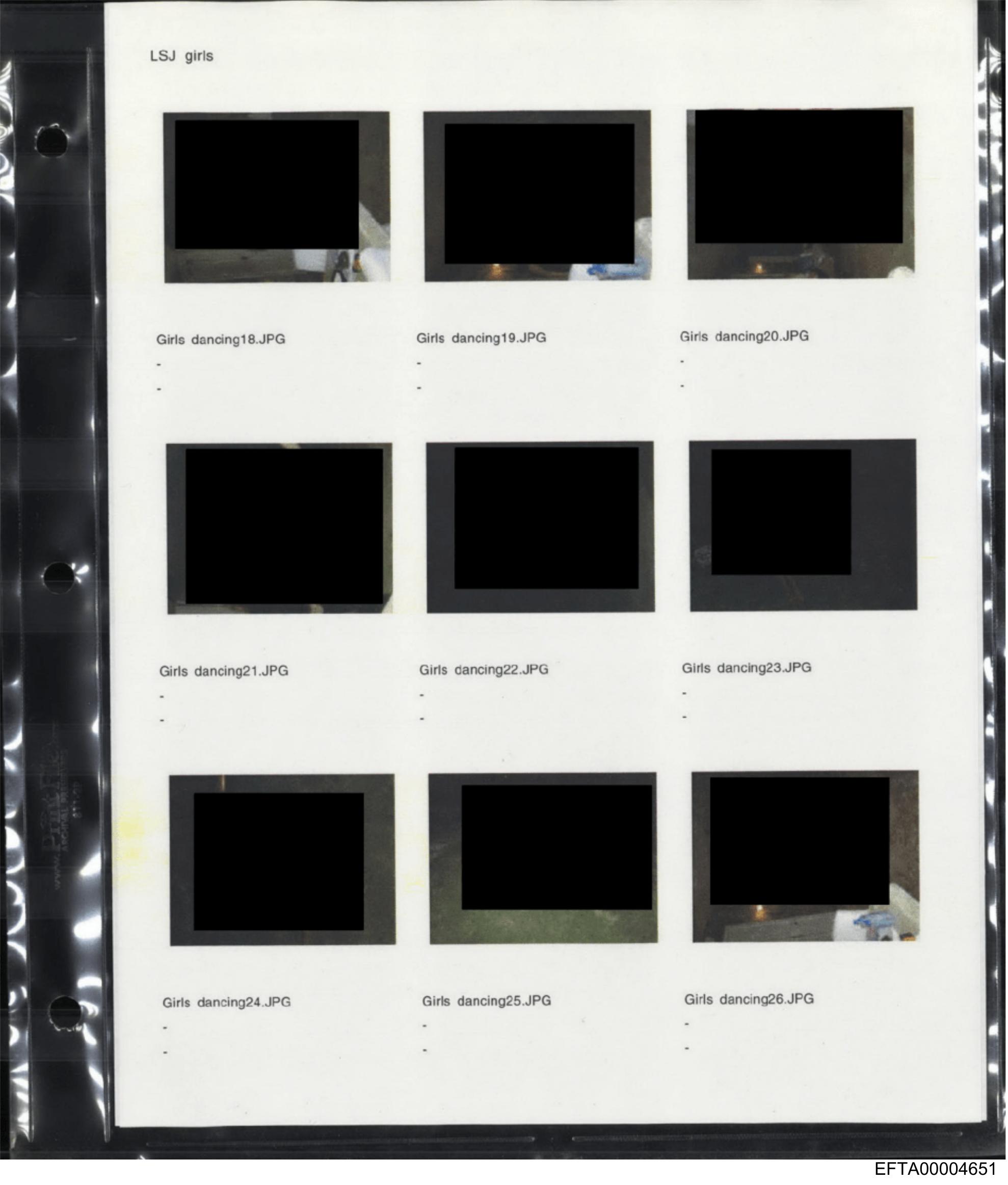 The image shows a series of thumbnail images placed on a sheet, possibly for printing or reviewing purposes. Each thumbnail has an area blacked out with a red rectangle, likely to obscure sensitive information or protect privacy. There is text overlaying the images, which appears to be file names or other identifiers, such as "Girls.jpg" and numbers like "10845." The quality of the thumbnails varies, with some showing clearer details than others. The overall style of the image suggests it might be related to photography, documentation, or a similar context where visual records are kept.