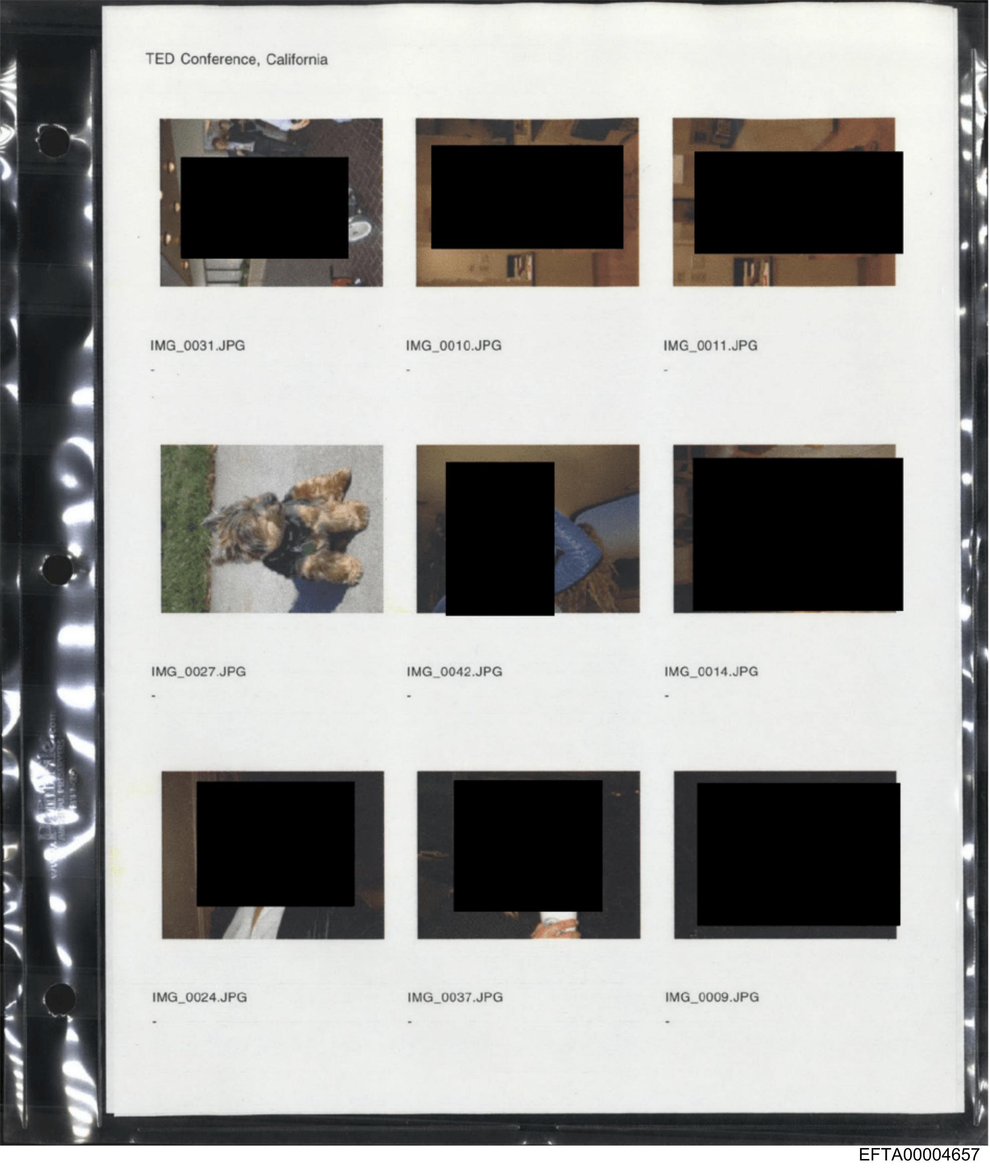 The image shows a collection of photographs displayed on what appears to be a piece of paper with a semi-transparent protective cover. The photos are arranged in rows and columns, each containing different scenes that seem to depict various subjects such as animals, landscapes, and possibly people or objects. The bottom right corner has one photograph significantly larger than the others, suggesting it might be highlighted or more significant than the rest. There is no visible text on the images themselves, but there are some numbers and letters near the corners of the photos that could indicate identifiers or references for each picture. The style of the image is candid and seems to have been taken in a casual setting, possibly at an event where these photographs were being presented or sold. The focus is on the content of the photographs rather than any specific people or locations in the frame, as their subjects are not clearly identifiable from this perspective.