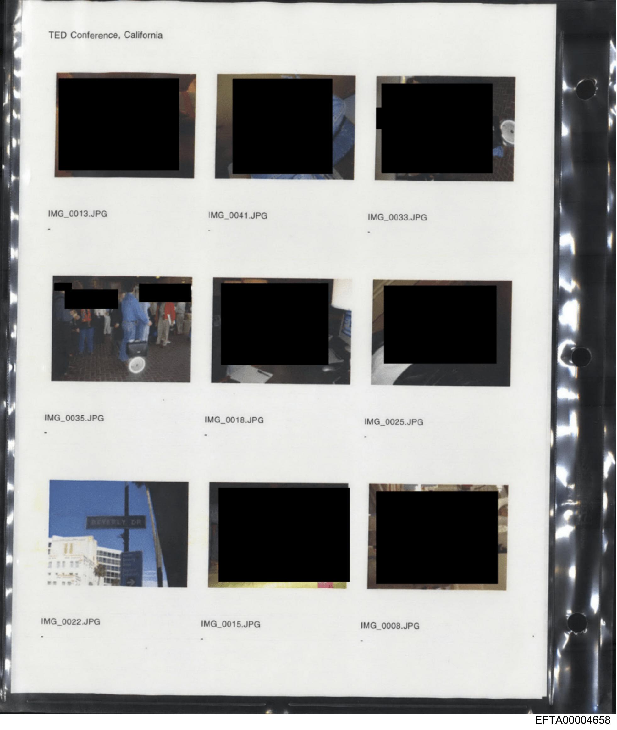 The image shows a presentation board with several photographs and accompanying descriptions. Each photograph is covered with black rectangles to obscure the content, indicating that sensitive information has been intentionally hidden. The titles for the photographs are visible on top of each rectangle and include phrases such as "CONFIDENTIAL - CALIFORNIA" and references to specific dates like "9-12-08." The text in the descriptions suggests that these images might be related to a specific event or location, possibly in California. The style of the image is informative, with an emphasis on visual content supported by textual context. The overall impression is that of a professional document designed to convey information in a secure manner, likely intended for discussion at an academic or official conference.