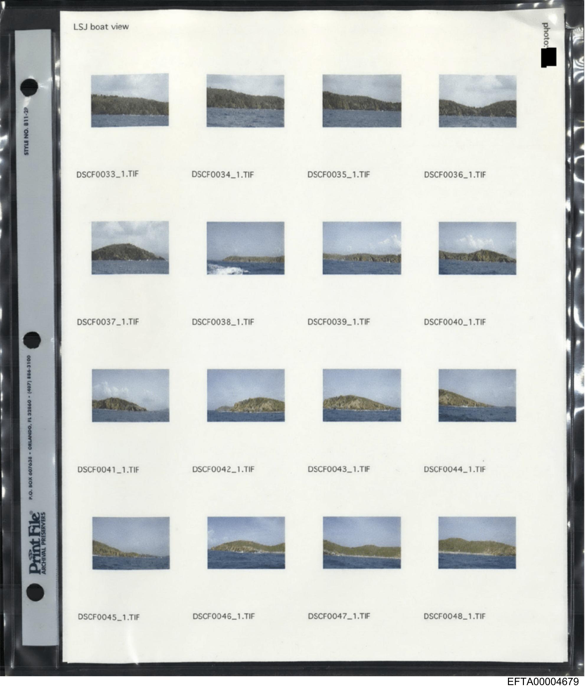 The image shows a strip of photographs secured by a paper border with holes on the top and bottom for binding purposes, typically found in photo albums or similar collections. The photos depict a coastal scene with a clear view of water, land, and what appears to be a mountainous island or peninsula in the distance under various lighting conditions, possibly indicating different times of day or weather. There are no visible texts, people, or specific locations discernible from this description.