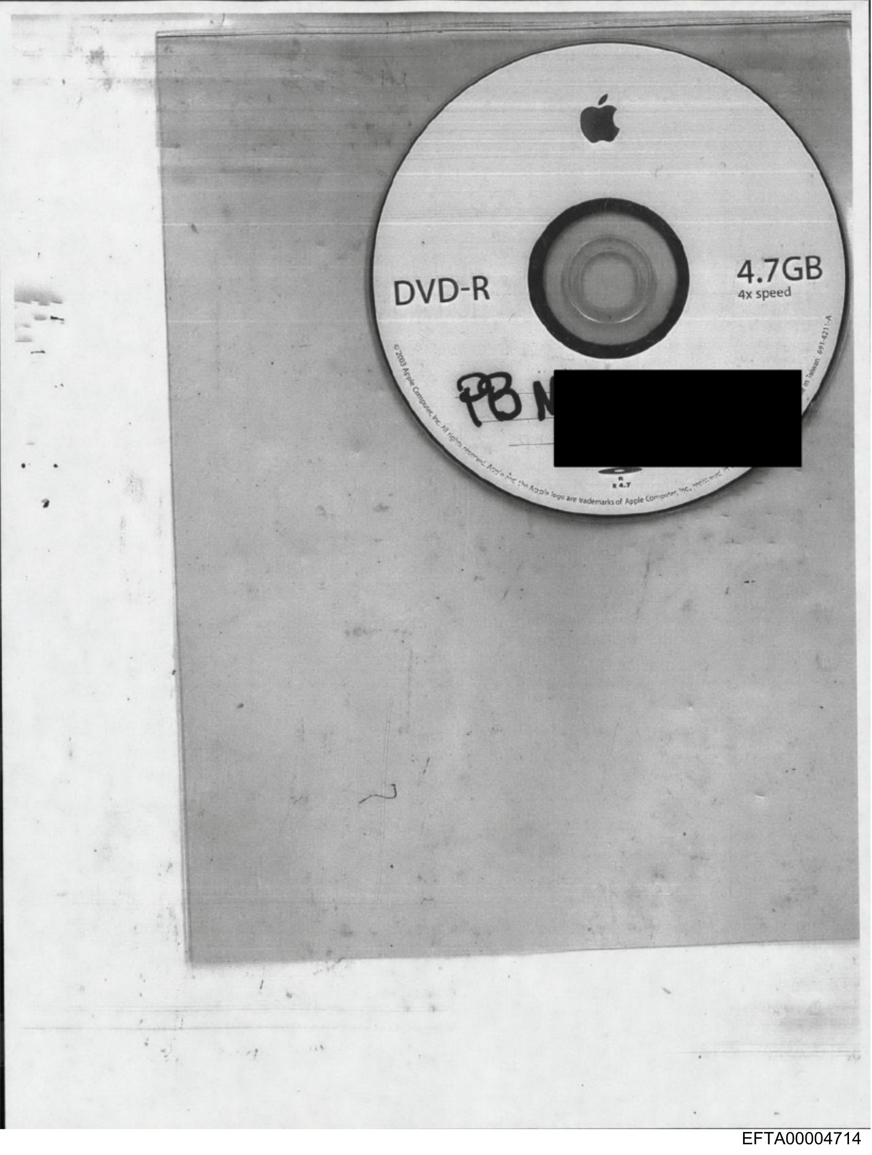The image shows a CD case with its contents partially visible. On the CD itself, there is text that reads "DVD-R" and below it, "4.7 GB." The CD appears to be an Apple brand product, given the logo on the disc. There are also two pieces of tape placed across parts of the image; one piece covers a section of the CD and another obscures part of the case's artwork. This suggests that the items have been handled or possibly sealed for security reasons. The style of the photograph is candid, with a focus on the details of the CD rather than the surrounding environment.