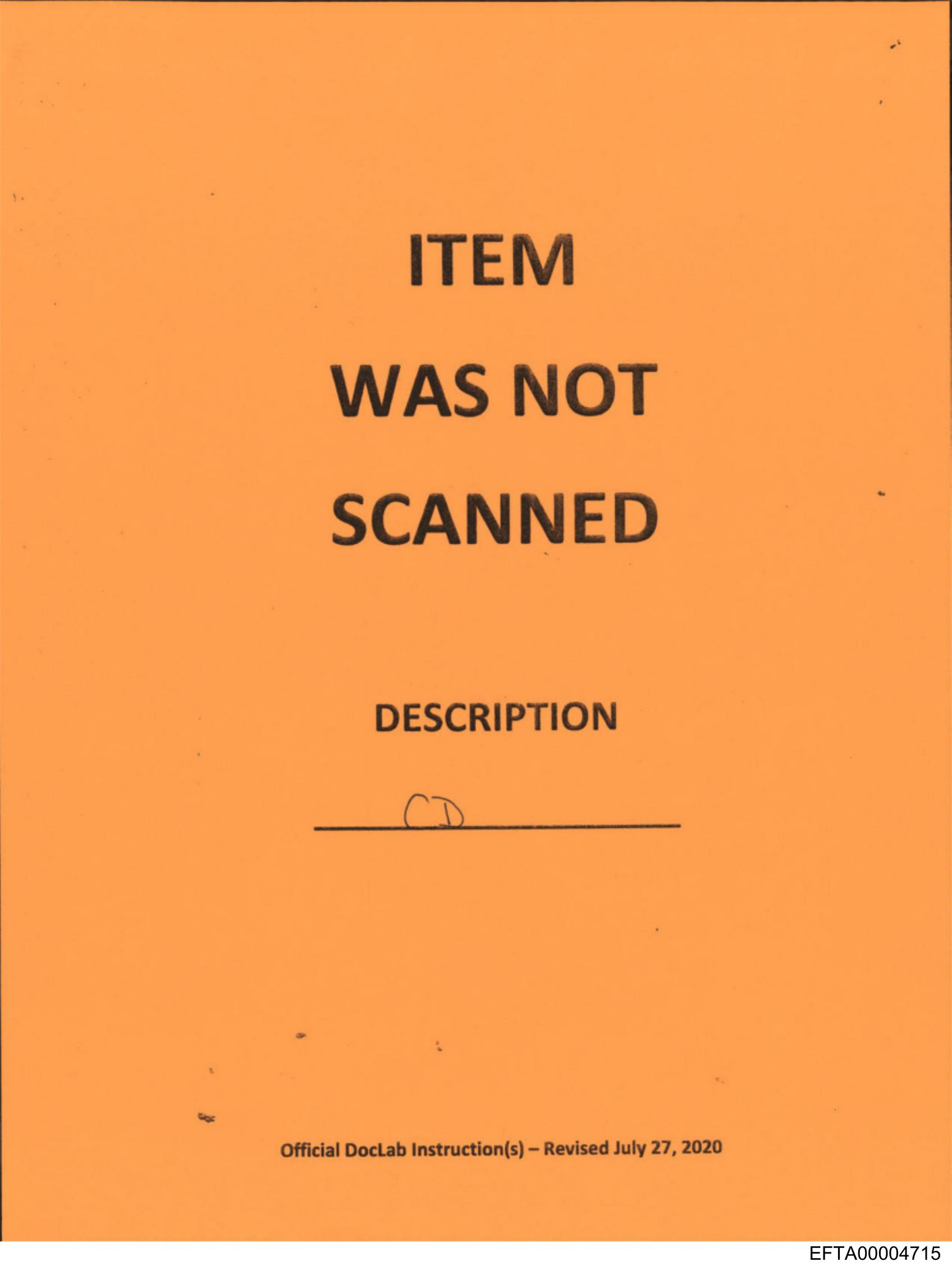 The image is a photograph of an orange warning label with black text that reads "ITEM WAS NOT SCANNED" at the top and beneath it there's space for writing where you can see handwritten "Description.