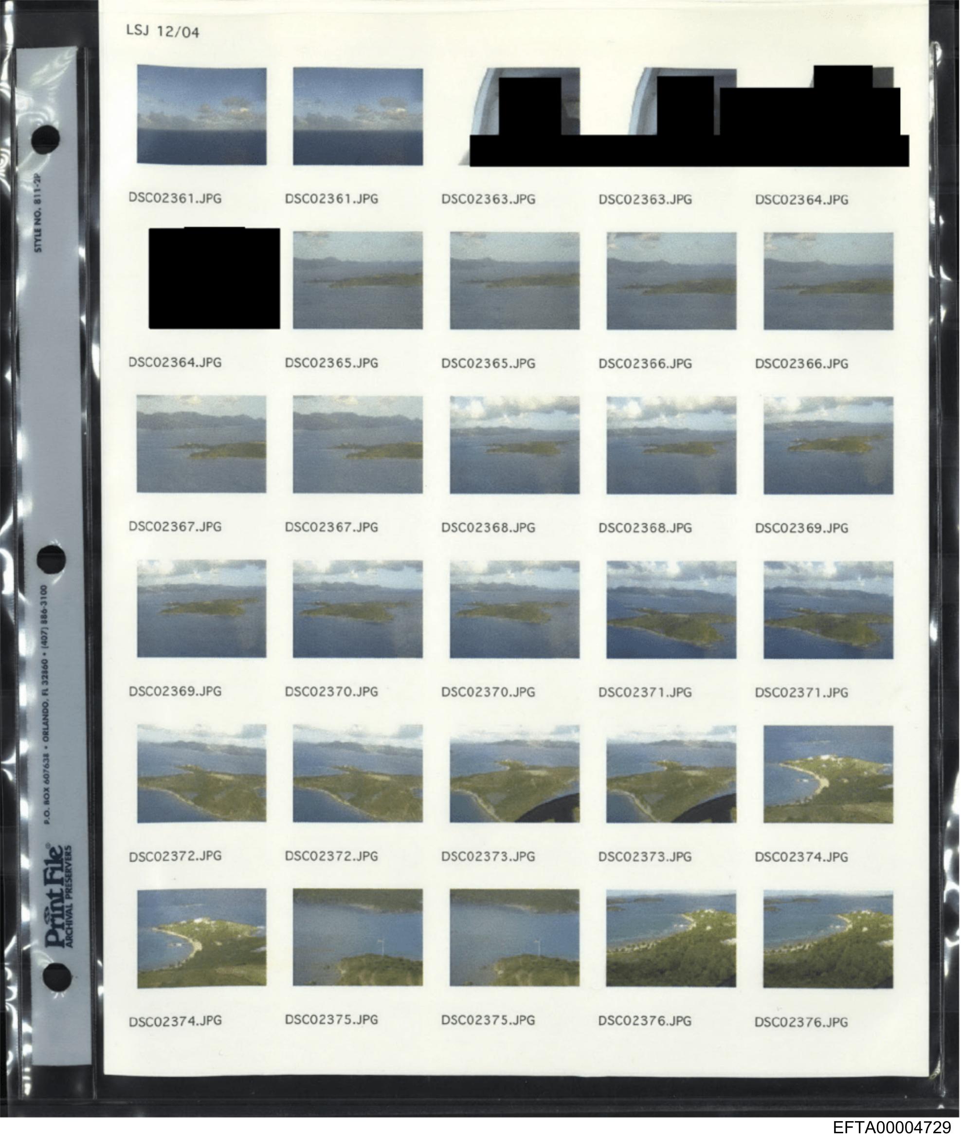 The image shows a series of photographs attached to a sheet with a hole punch pattern, suggesting they are meant for a scrapbook or similar project. The photos depict various scenic views, possibly taken from an airplane window due to the perspective and the visible clouds and land formations. There is no text overlaying the images. The style of the image is documentary, capturing moments in time as seen through the lens.