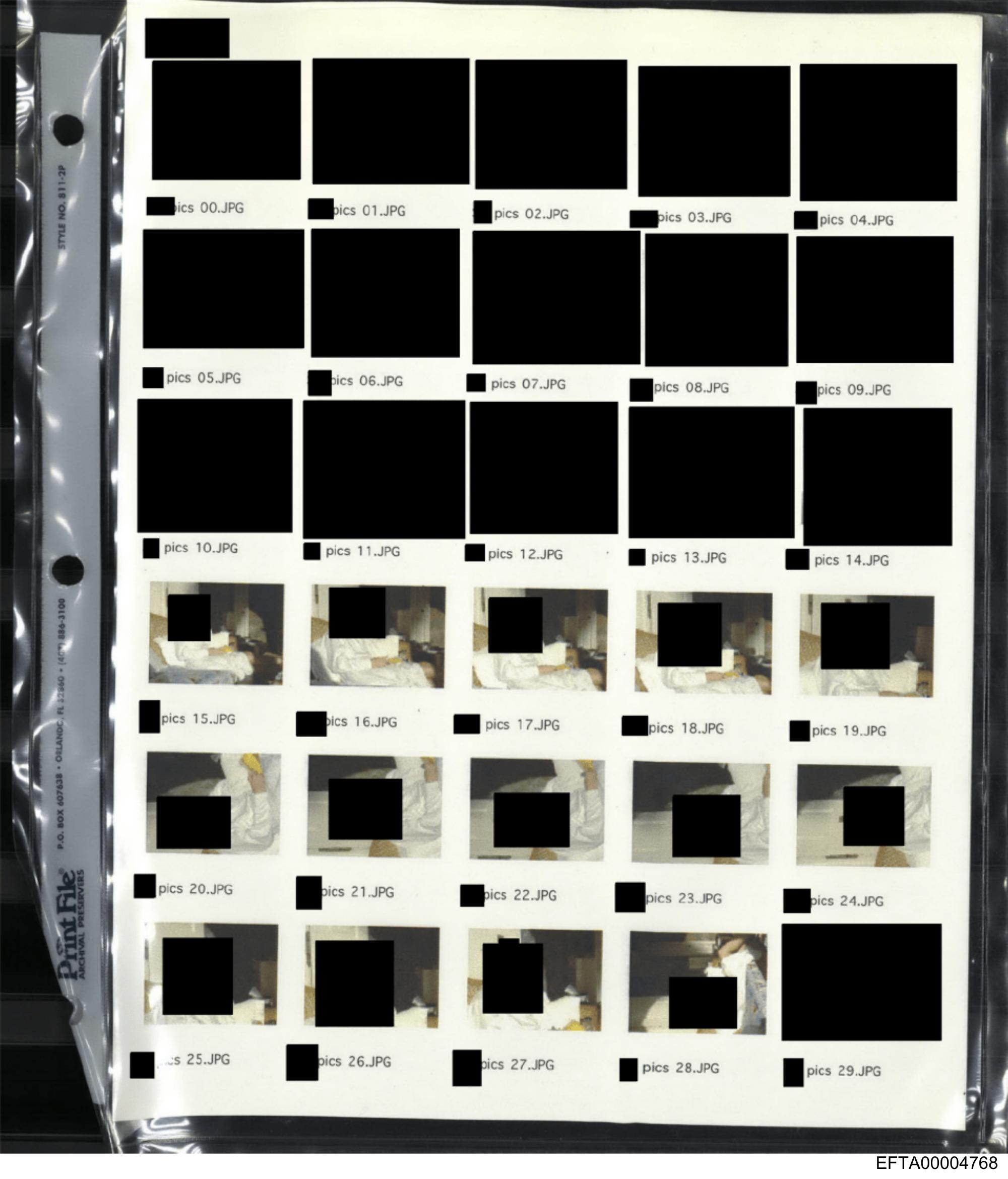The image shows a collection of photographs arranged neatly on what appears to be a transparent surface, possibly a plastic page protector. These photos are overlaid with black rectangles that obscure the images within them, likely for privacy or security reasons. The visible text is minimal and mostly consists of the logos of camera manufacturers at the top corners, such as "NIKON" and "SONY". There are no people or specific locations identifiable due to the obscuring black rectangles. The overall impression is that this may be a collection of sensitive material being protected from unauthorized viewing.