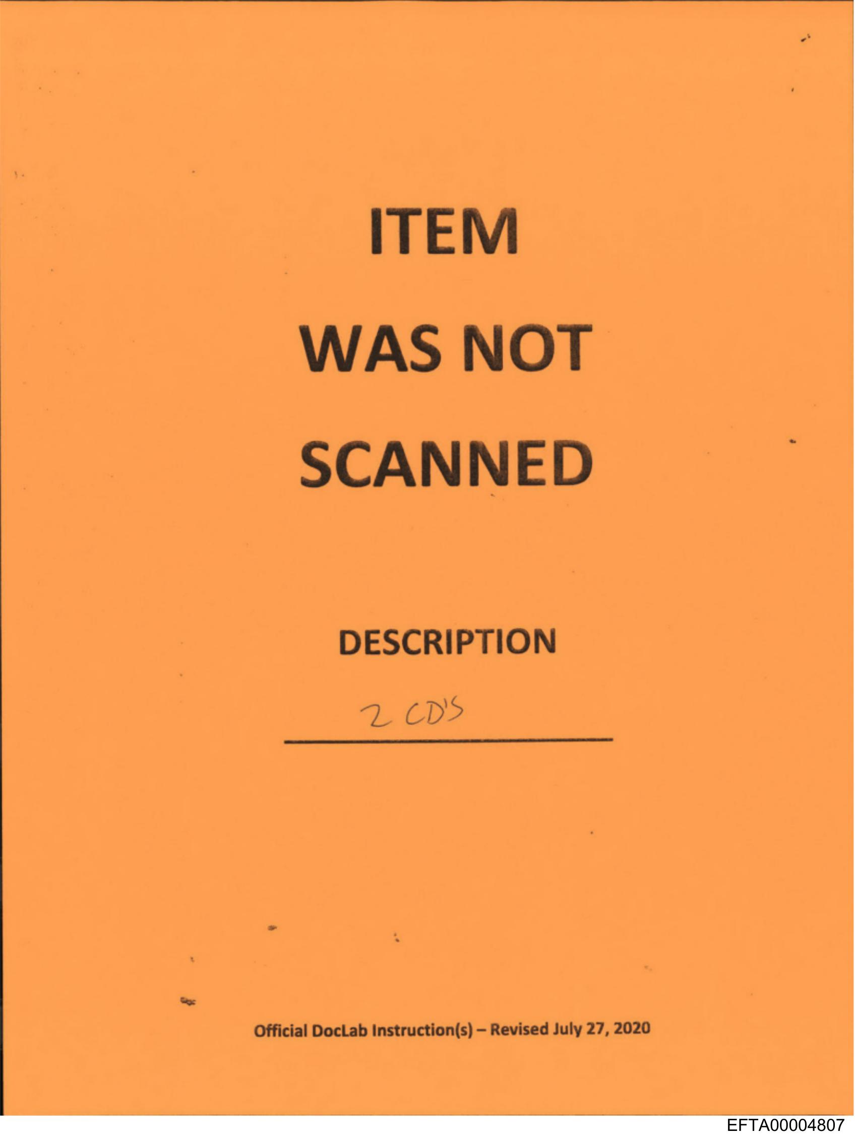 The image shows a piece of paper with printed and handwritten text on it. The paper is predominantly yellowish orange, and the top half features the words "ITEM WAS NOT SCANNED" in bold black letters. Below this, there is some text that appears to be a description or code, followed by an illegible signature. At the bottom of the page, there are additional instructions which seem to be related to official guidelines for submitting documents, however, they are not entirely clear due to the resolution of the image. There's also a date mentioned at the bottom right corner, indicating that these instructions were last read on July 29, 2008.
