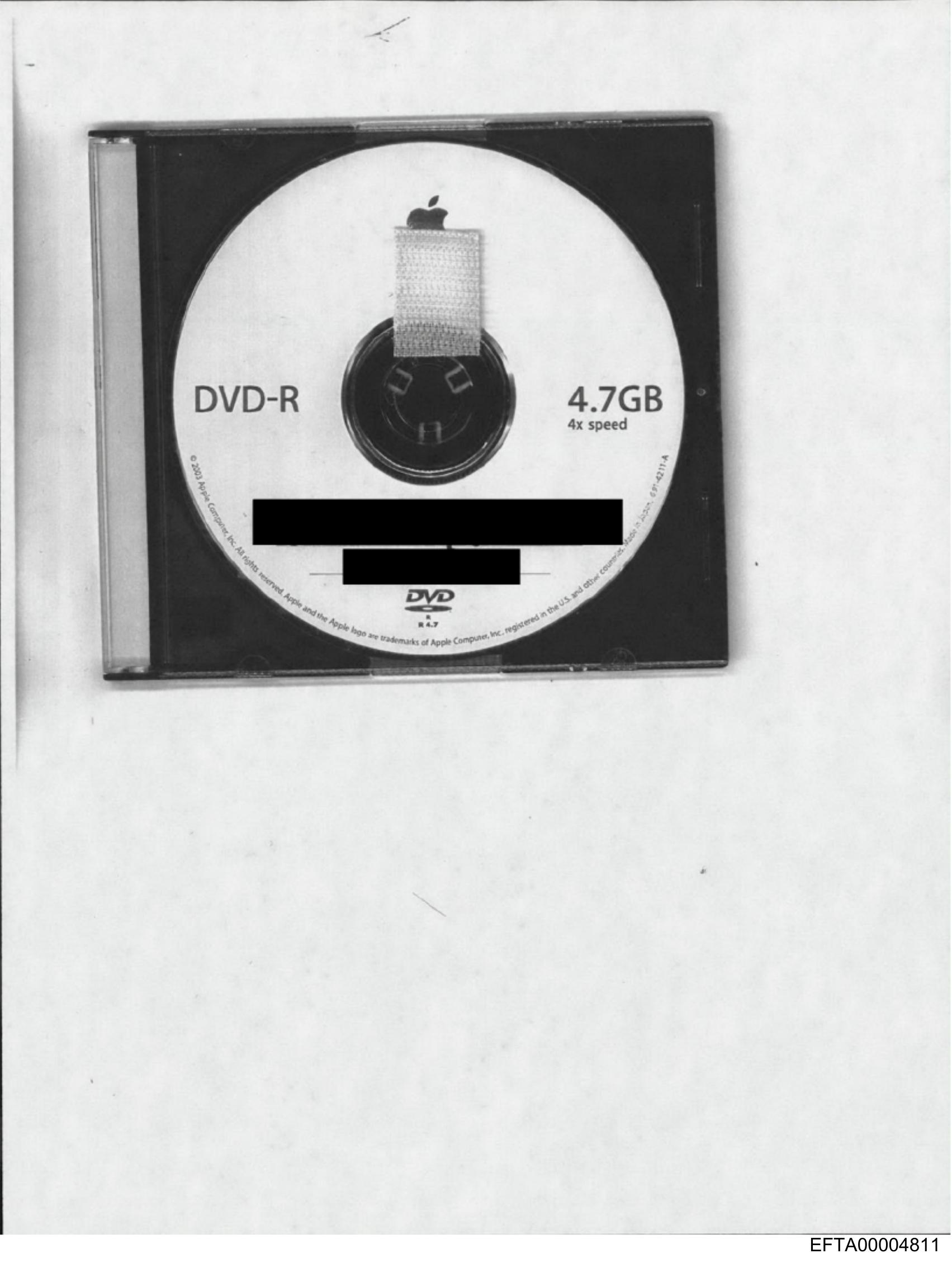 The image shows a DVD case with the disc partially inserted into it. The visible part of the disc has text that includes "DVD+R" indicating the type of disc and its capability for recording data once only. Below that, there's the capacity of the disc indicated as "4.7GB" which is the standard size for a single-layer DVD+R disc. There are also some obscured areas of the text where characters have been replaced with black marks to hide information or prevent recognition. The style of the image appears to be a photograph due to its realistic colors and the slight shadow on the surface below the case.