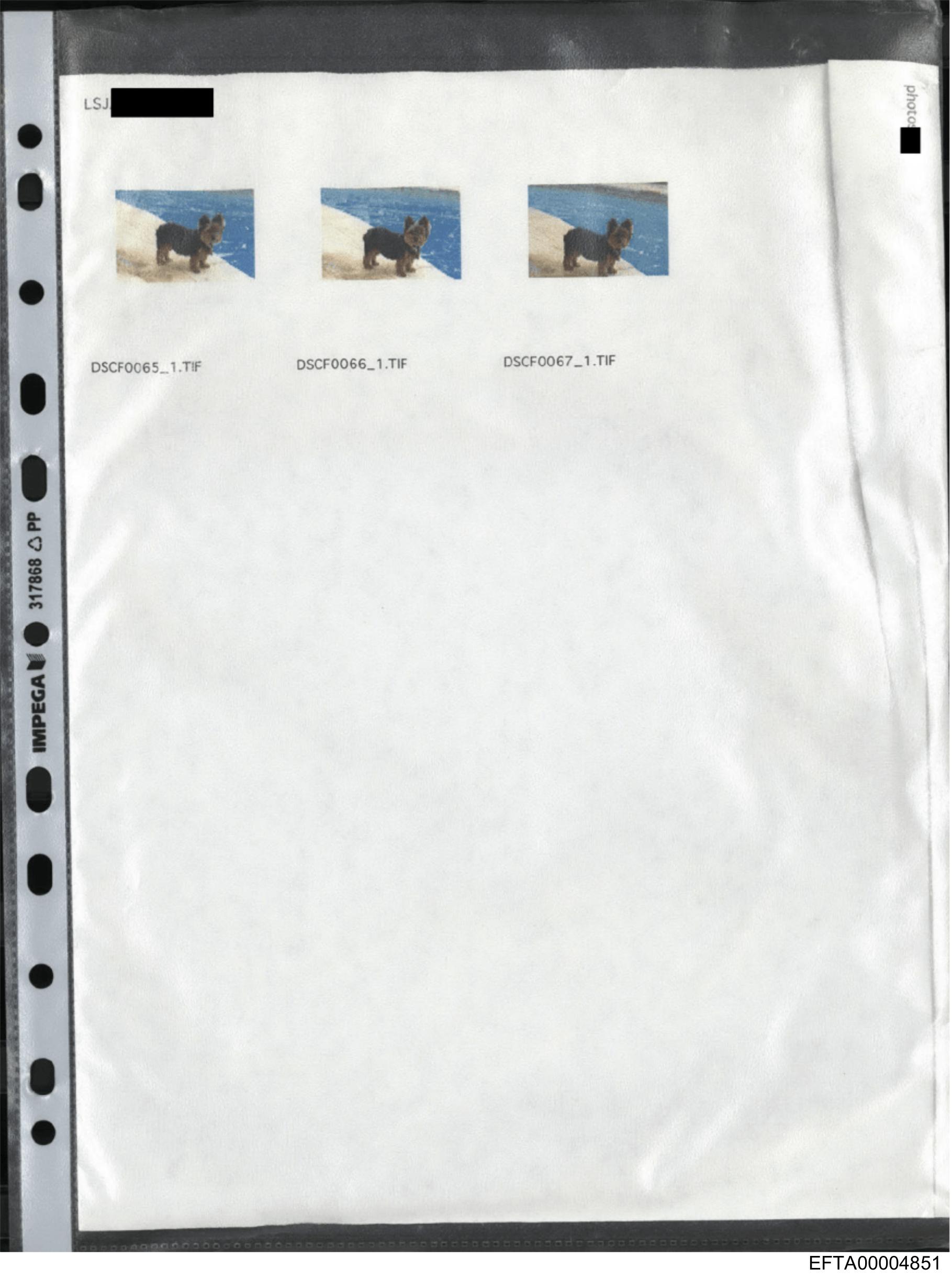 The image shows a small piece of paper with three photographs printed on it. Each photograph features the same dog from different angles: one full body shot facing forward, another profile view, and a third showing the back end of the dog. The background in all three photos is consistent, suggesting they were taken at the same location, possibly an outdoor space with blue sky visible. There is text overlaying the images, but it's partially obscured; however, from what can be seen, there appears to be a date and possibly some other numbers or information that may refer to a tracking or identification system for items like photos or pets. The top left corner of the paper has a barcode, which further suggests an item meant for sorting or cataloging purposes.