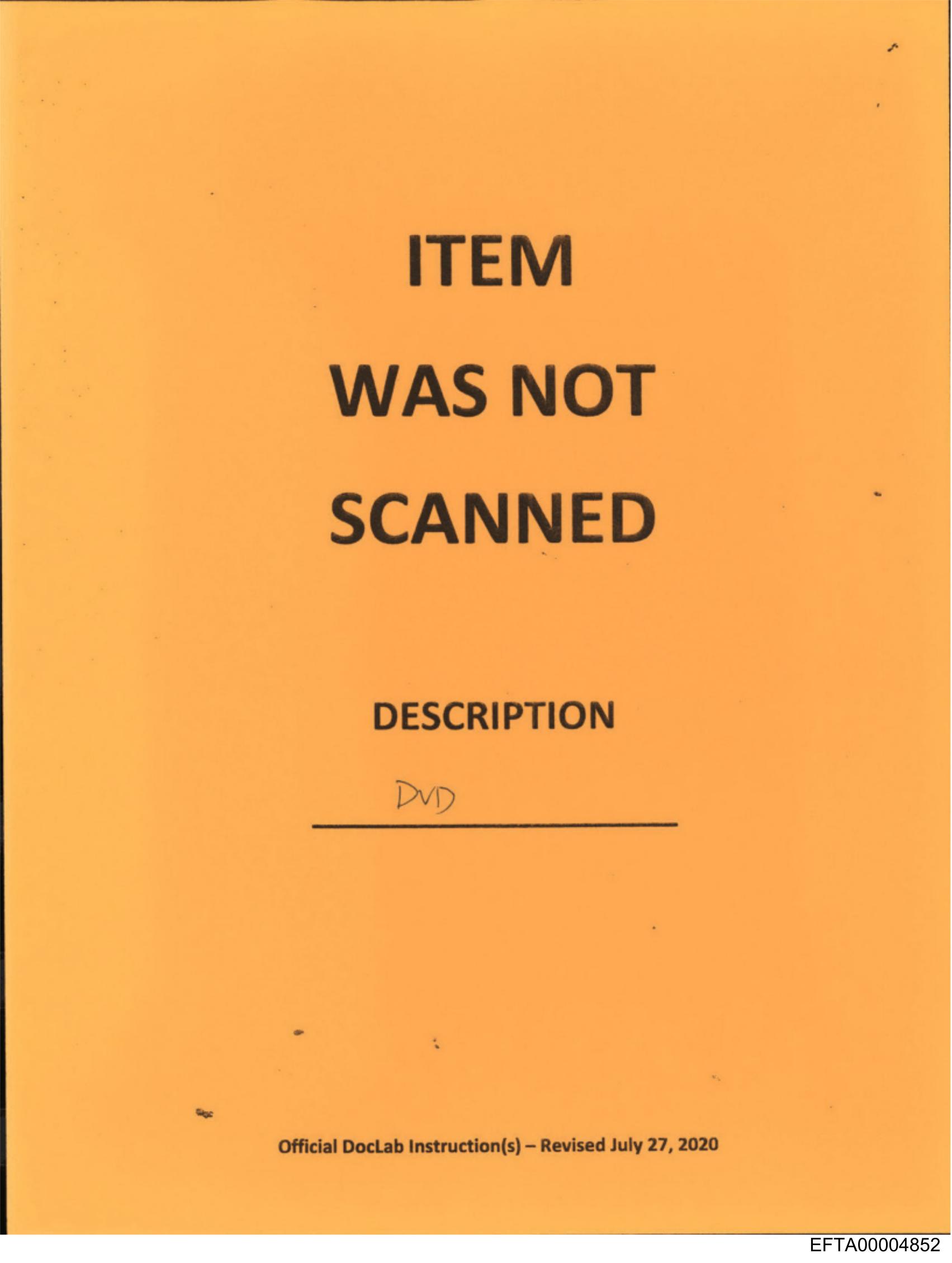 The image shows a yellow sign with printed text that states "ITEM WAS NOT SCANNED" and below it, there is handwritten text that reads "DVD.