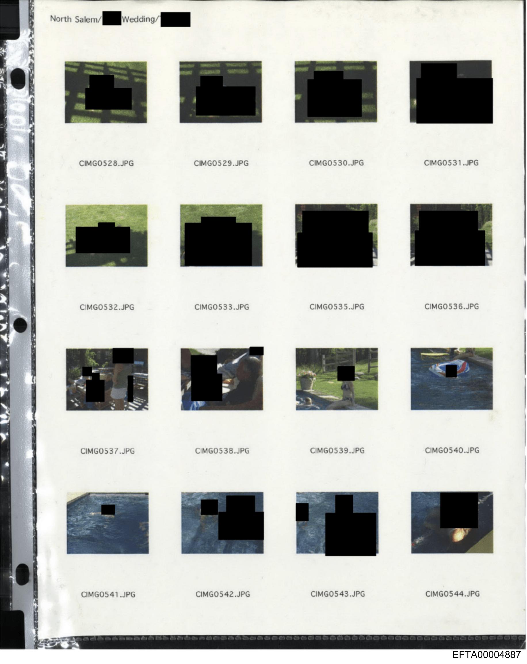 The image appears to be a photograph of an album page displaying several photographs from a wedding. Each photo is encased within its own border and labeled with numbers that likely correspond to some sort of cataloging system. The visible texts include "Wedding Album" at the top, followed by the word "Photos" in large letters on the bottom. There are also handwritten notes covering parts of the photos, including phrases like "Papa," which could indicate personal identification or annotations made by someone familiar with the people in the photographs. The setting suggests a significant event, and the photos capture moments from that occasion.