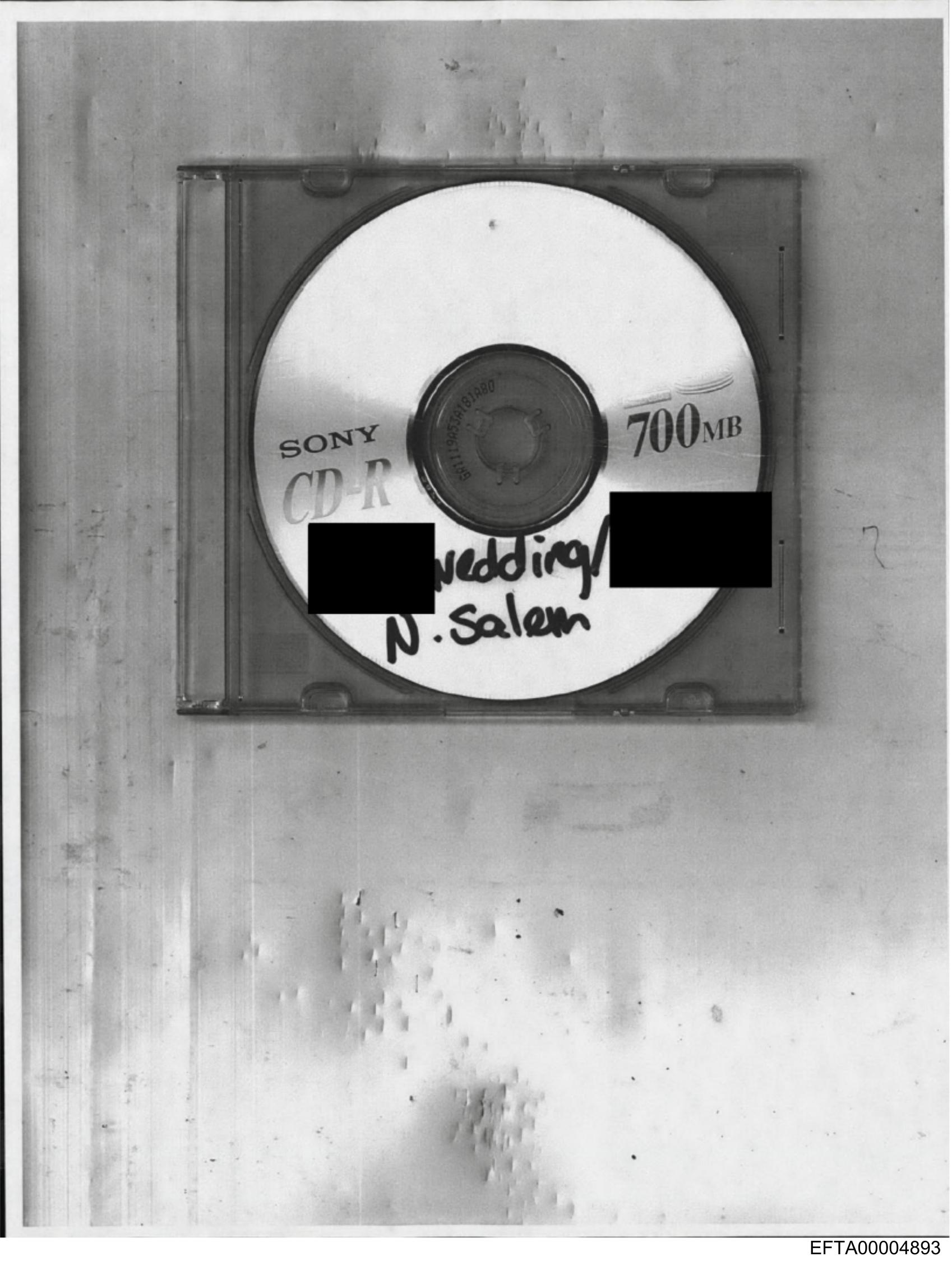 The image shows a CD placed on a surface with some scratches and marks visible on it. The CD appears to be of the Sony brand, as indicated by the logo and the words "700MB" suggesting its storage capacity. There is handwritten text that reads "wedding video" with the name or title "Nathan" obscured, implying that this CD might contain a video from a wedding event for someone named Nathan. The quality of the image has a grainy texture, which could suggest it was taken with an older camera or under low light conditions.