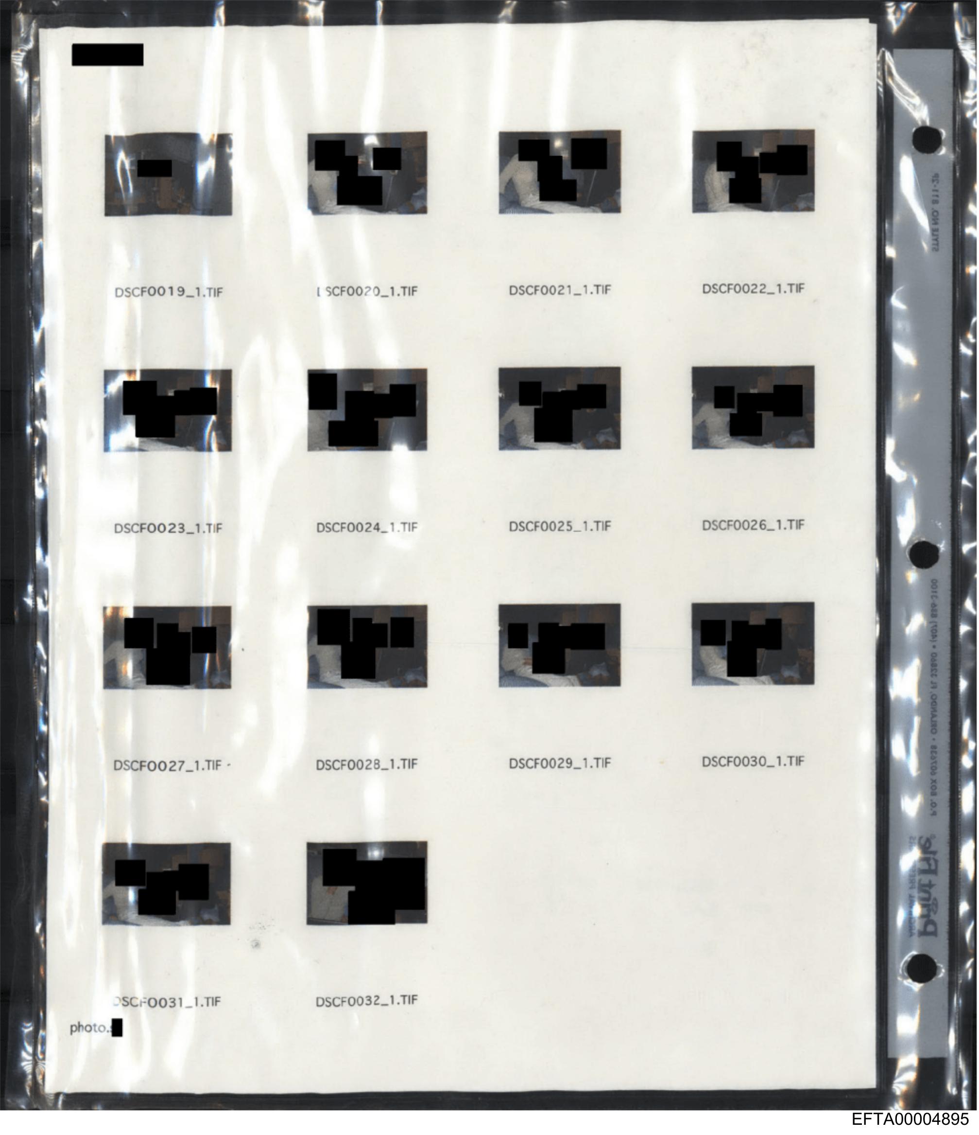 The image shows a piece of paper with several black and white photographs or images printed on it. The photos are arranged in rows, each depicting what appears to be the same scene but from different angles or moments. Some parts of the images are obscured by redacted lines, indicating that sensitive information has been removed for privacy or security reasons. There is visible text in a column along the left side of the paper, which seems to include references or labels related to the images, but specific details about the content are not discernible due to the redaction. The overall style of the image suggests it could be an official document or a record kept for archival purposes.