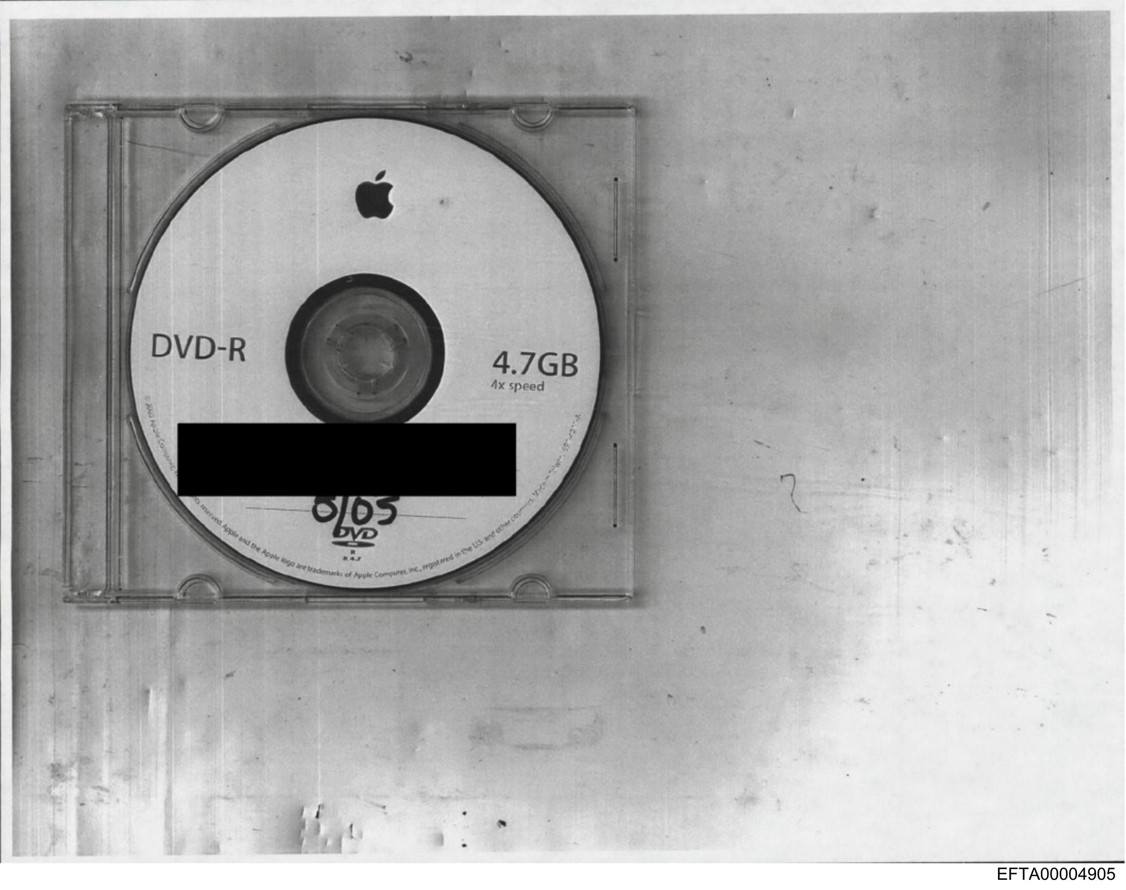 The image shows a DVD disc with an Apple logo on its label. The disc is placed against a plain background and appears to be inserted into a plastic case designed for DVDs, as indicated by the partial view of the spindle. There's text visible on the disc that includes "DVD-R" and "4.7 GB" which are specifications indicating it's a recordable DVD with 4.7 gigabytes of storage capacity. Additionally, there is some handwritten marking over part of the disc's label; however, this does not interfere with the visibility of the Apple logo or other important information about the disc.