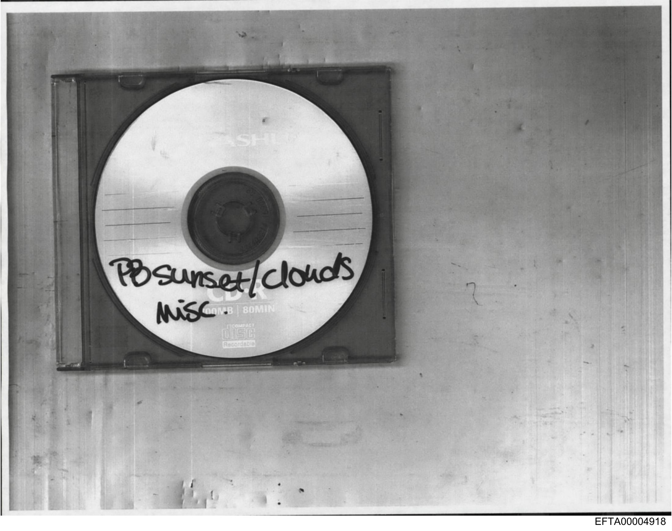 The image appears to be a photograph of an object with writing on it placed against a nondescript background that's slightly out of focus. The central item seems to be a disc, possibly a CD or vinyl record, given the visible tracks and concentric circles typically found on such media. There is handwritten text on the disc that reads "PS Sunset/Clouds Music." The style of the image suggests it may have been taken with an analog camera due to the graininess and faded quality common in older photographs.