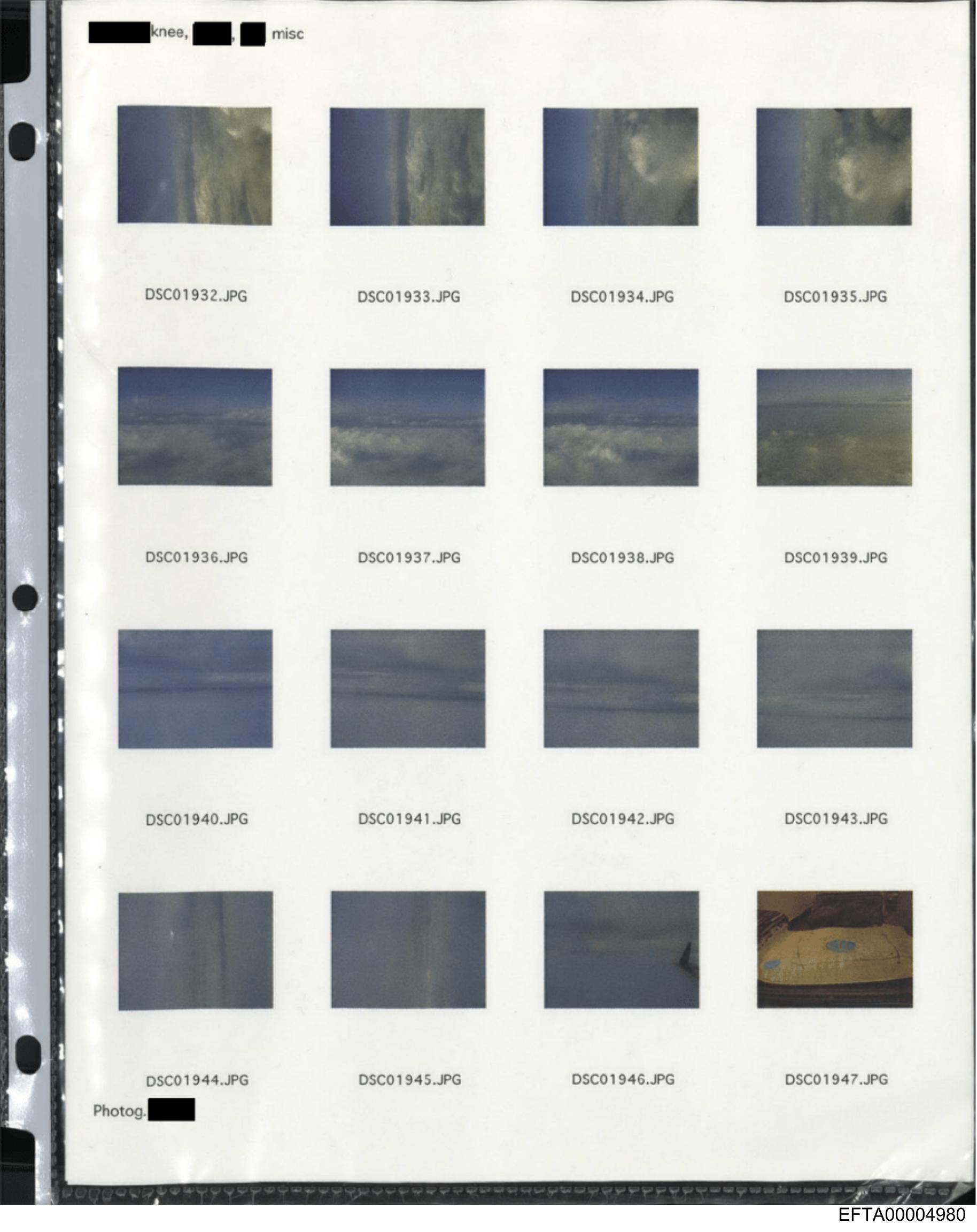 The image shows a strip of photographs with various subjects and scenes. The photos appear to have been taken from an aircraft looking out at the sky, clouds, and possibly parts of buildings, suggesting they might be aerial views. There is some text visible on the top right corner of the images, which seems to include numbers and other identifiers, likely metadata for each photograph such as a serial number or a code related to the collection from where these images are sourced. The style of the image is documentary, capturing real-life scenes without any apparent artistic alteration.