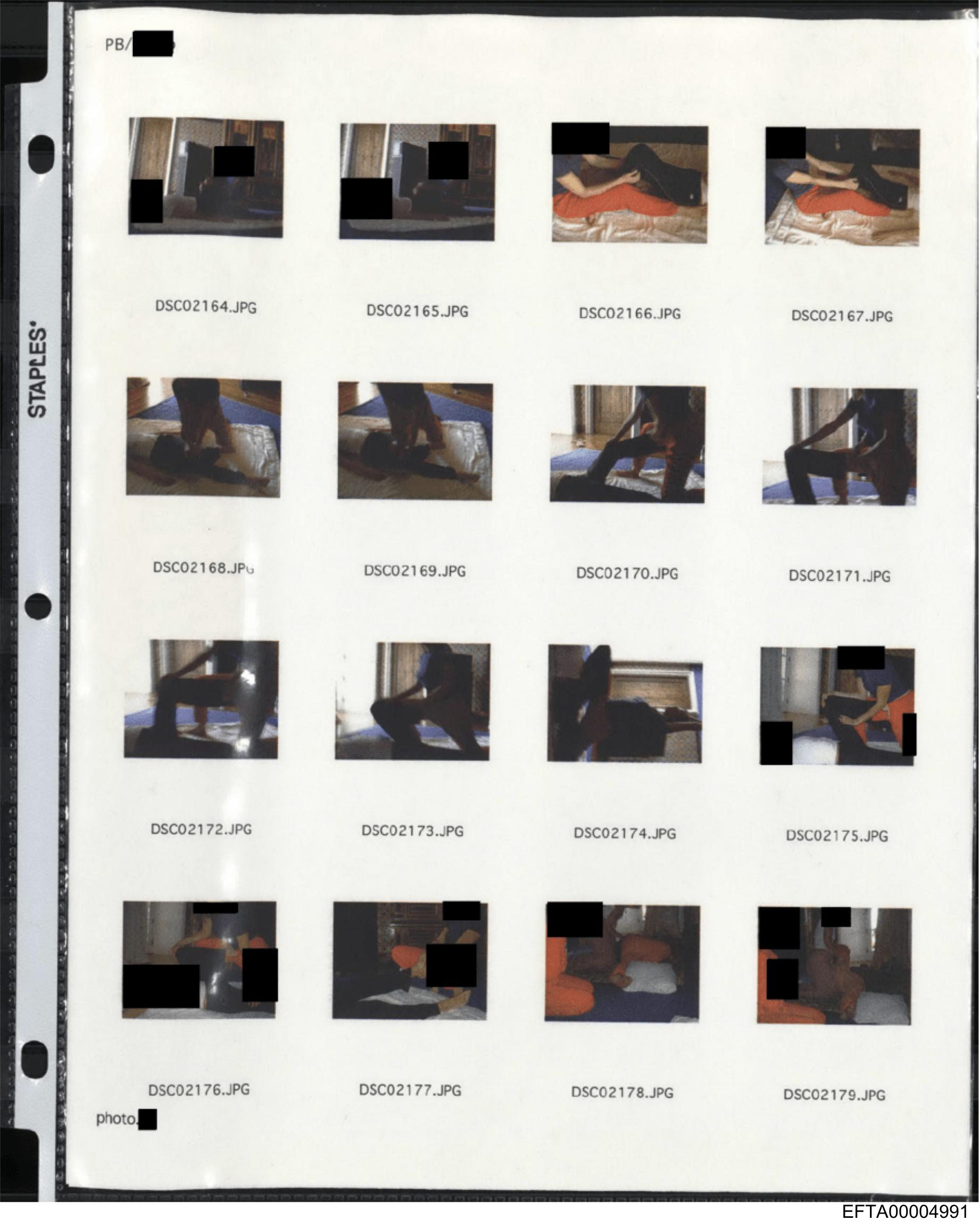 The image shows a collection of small photographs printed on strips that resemble traditional film negatives. These strips are attached to what appears to be an index card with handwritten notes at the top left corner. Each photograph captures different scenes, including individuals and interior spaces. The photos are dated with text such as "12-30-84" and "12-27-85," suggesting they were taken in December 1984 and 1985. There's a visible watermark or logo that reads "NKW" at the bottom left corner of each strip. The images are arranged neatly, with some blacked out areas over parts of the photos, likely to obscure sensitive information or maintain privacy.