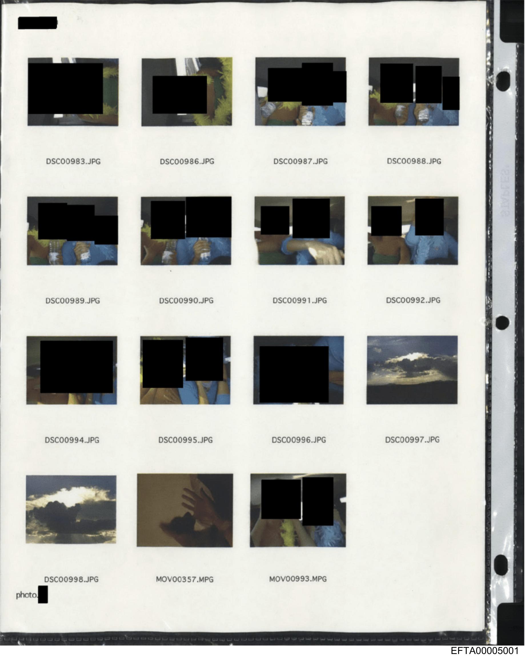 The image shows a printed document with several photographs arranged in rows and columns on it. Each photograph is accompanied by text that appears to provide information about the images, possibly including their file names or descriptions. The majority of the images are obscured by redacted boxes, making their content indistinguishable. At the bottom right corner, there is a smaller image without any redaction, revealing a cloudy sky and what seems to be an outdoor scene. The document has perforated edges, suggesting it may have been torn from a larger piece of paper or a notebook.