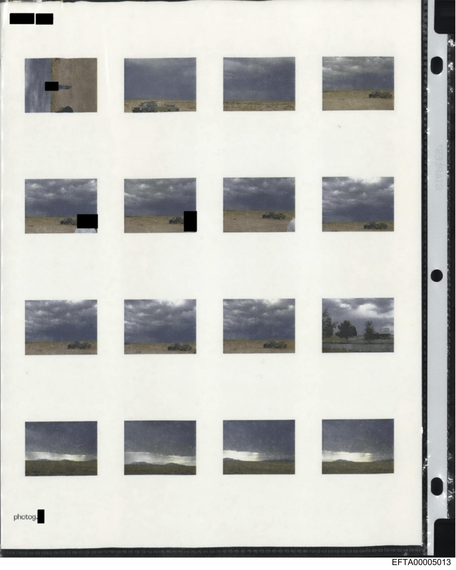 The image is a strip of photographs depicting landscapes under various weather conditions. The top left photo shows clear skies, the middle right has cloudy skies, and the bottom right has stormy clouds. Each photo captures different types of terrains, including hills and valleys. The photos are separated by black lines with white dots on both sides, which is typical for film strips to maintain alignment during projection or viewing.