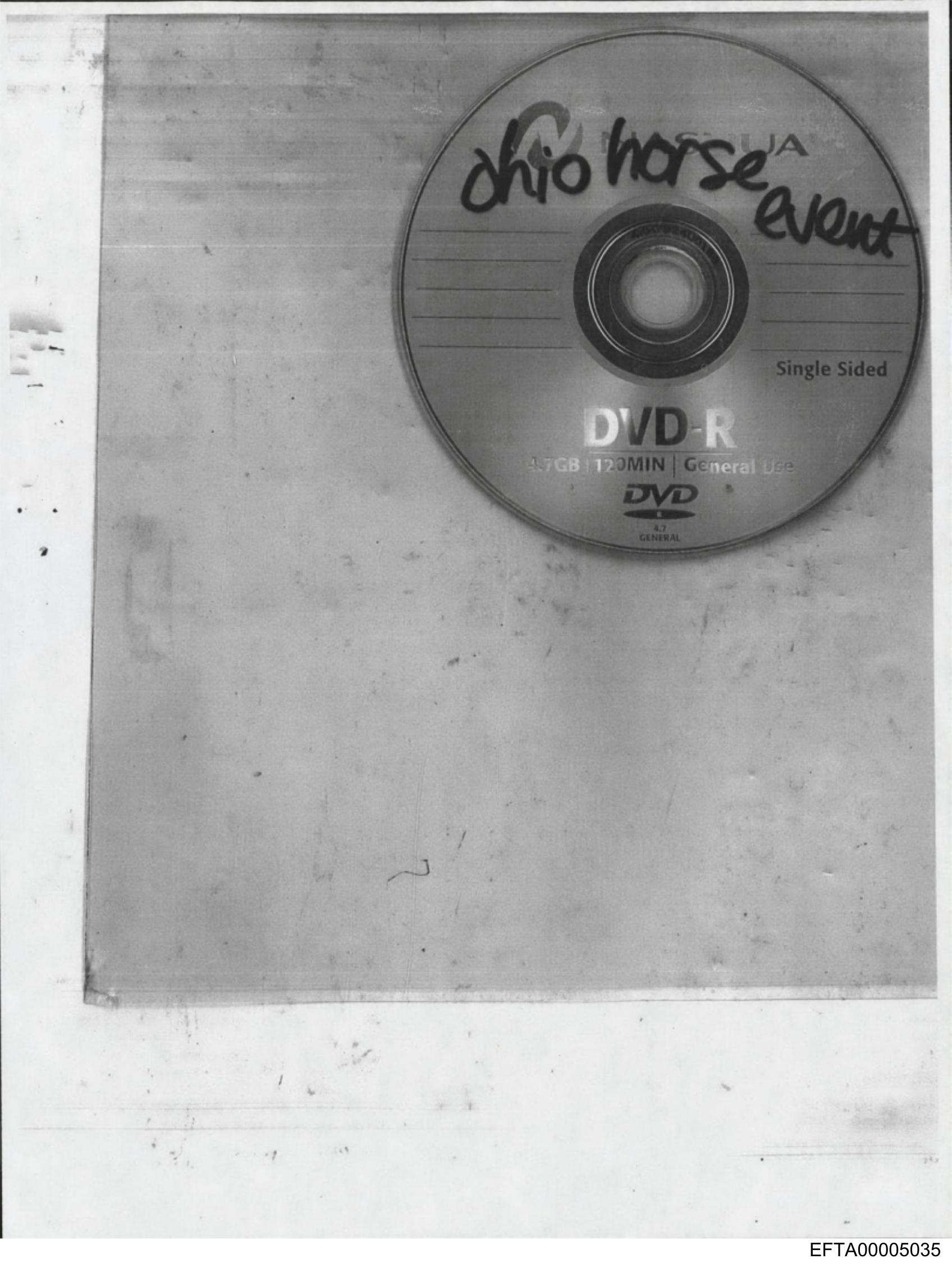 The image shows a disc with text and markings on it. The text includes "OHIO HORSE EVENTS" written vertically down the left side of the disc. At the top right corner, there is a logo that reads "DVD-R" indicating the type or format of the disc. Additionally, there's some handwritten text at the bottom right corner of the disc which appears to be crossed out; however, it's not clear enough to read accurately. The background behind the disc has various markings and scuffs, suggesting that the disc may have been handled roughly or stored in a place where it could get damaged.