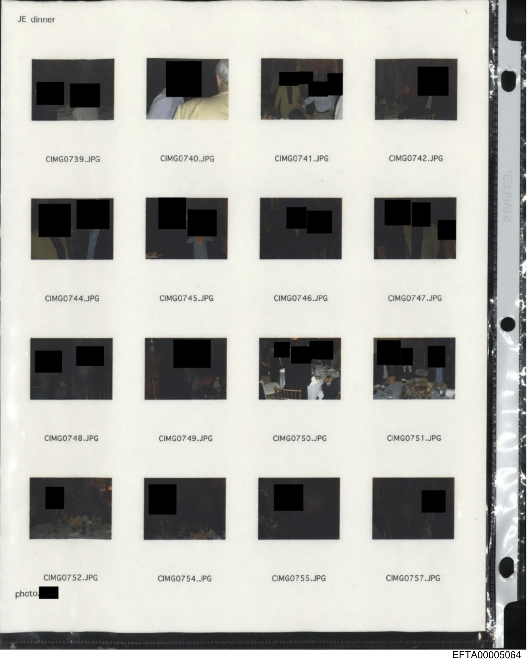 The image shows a printed strip of photographs with nine individual frames arranged vertically on a sheet. Each frame contains a different photograph, and they all appear to be from an event or gathering, featuring various indoor scenes and possibly people in some shots. The quality of the images is somewhat grainy, suggesting that these may be older photos. Some frames have been redacted with large black squares covering the photographs, likely to obscure sensitive information or personal identity details.