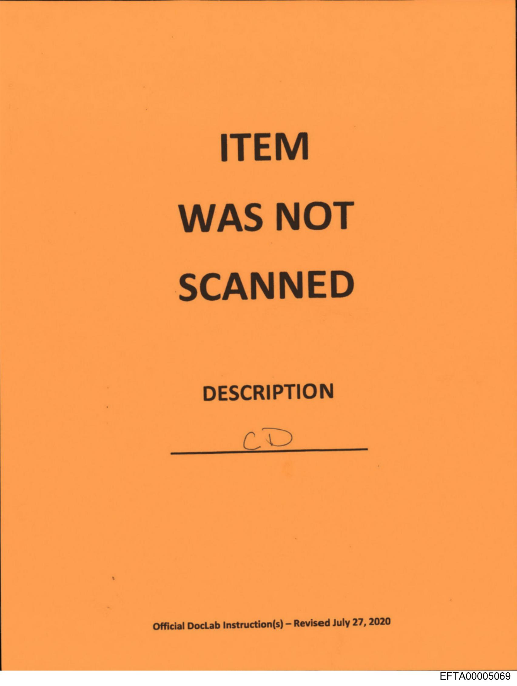 The image shows an orange form with printed text and a handwritten entry at the bottom. The main text reads "ITEM WAS NOT SCANNED" in bold letters, indicating a warning or notice regarding the absence of a scan for a particular item. There is also smaller text that provides additional information: "Description" followed by two lines where details can be filled out, and below it, "Official Receipt," suggesting that this form might be related to an official receipt where items are recorded. The bottom right corner has a handwritten entry with what appears to be a code or reference number in black ink. There is no visible person or location on the form itself.