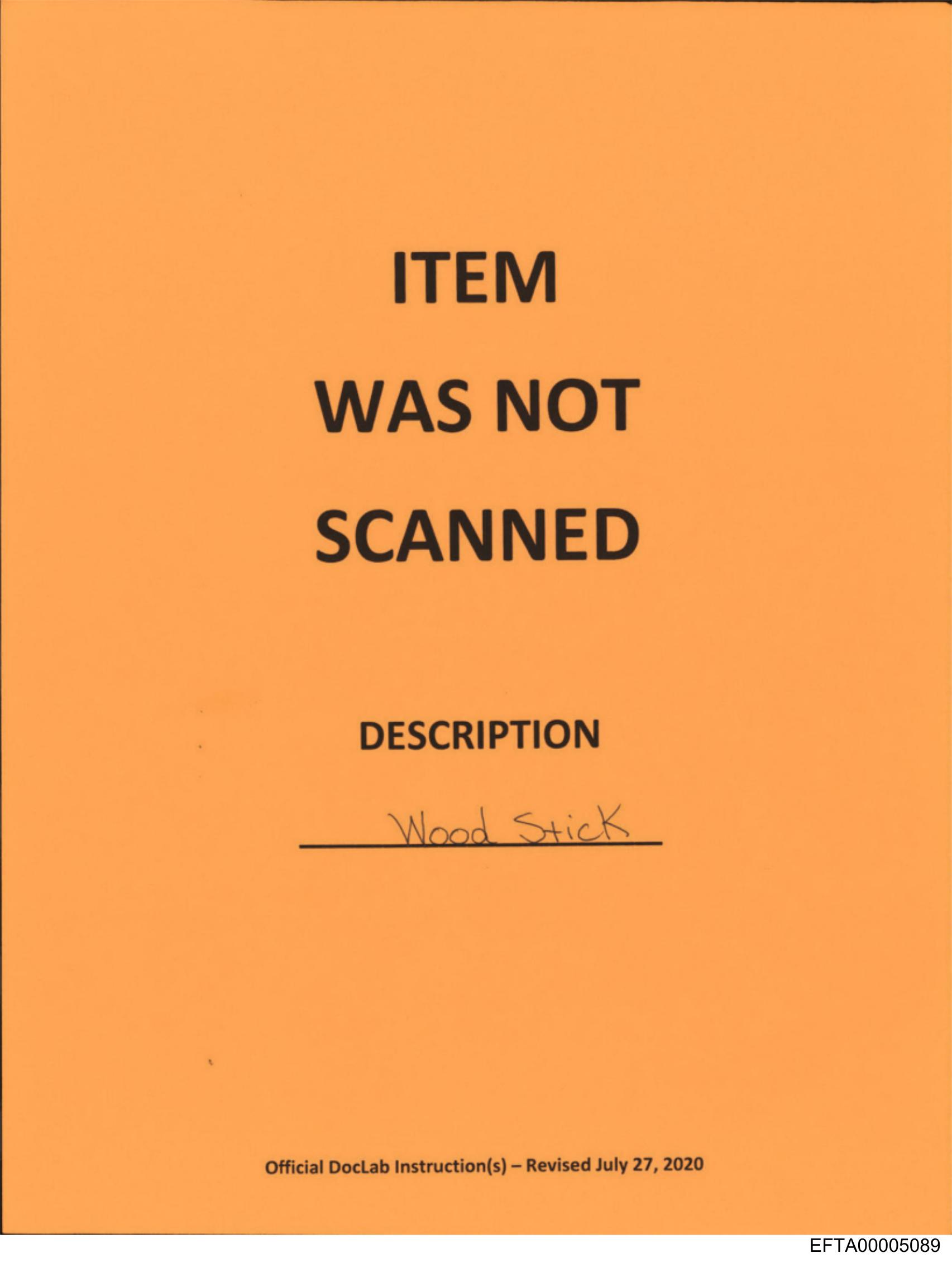 The image displays a yellow notice with black text and handwritten notes. The main message states "ITEM WAS NOT SCANNED" followed by the word "Description" in bold letters at the top. Below this, there's space for writing, and someone has hand-written "Wood Stick" underneath the title. Additional information includes an official disclaimer or notice at the bottom, which is too small to read clearly. The style of the image suggests it might be a photograph taken with a mobile device due to its casual framing and focus.