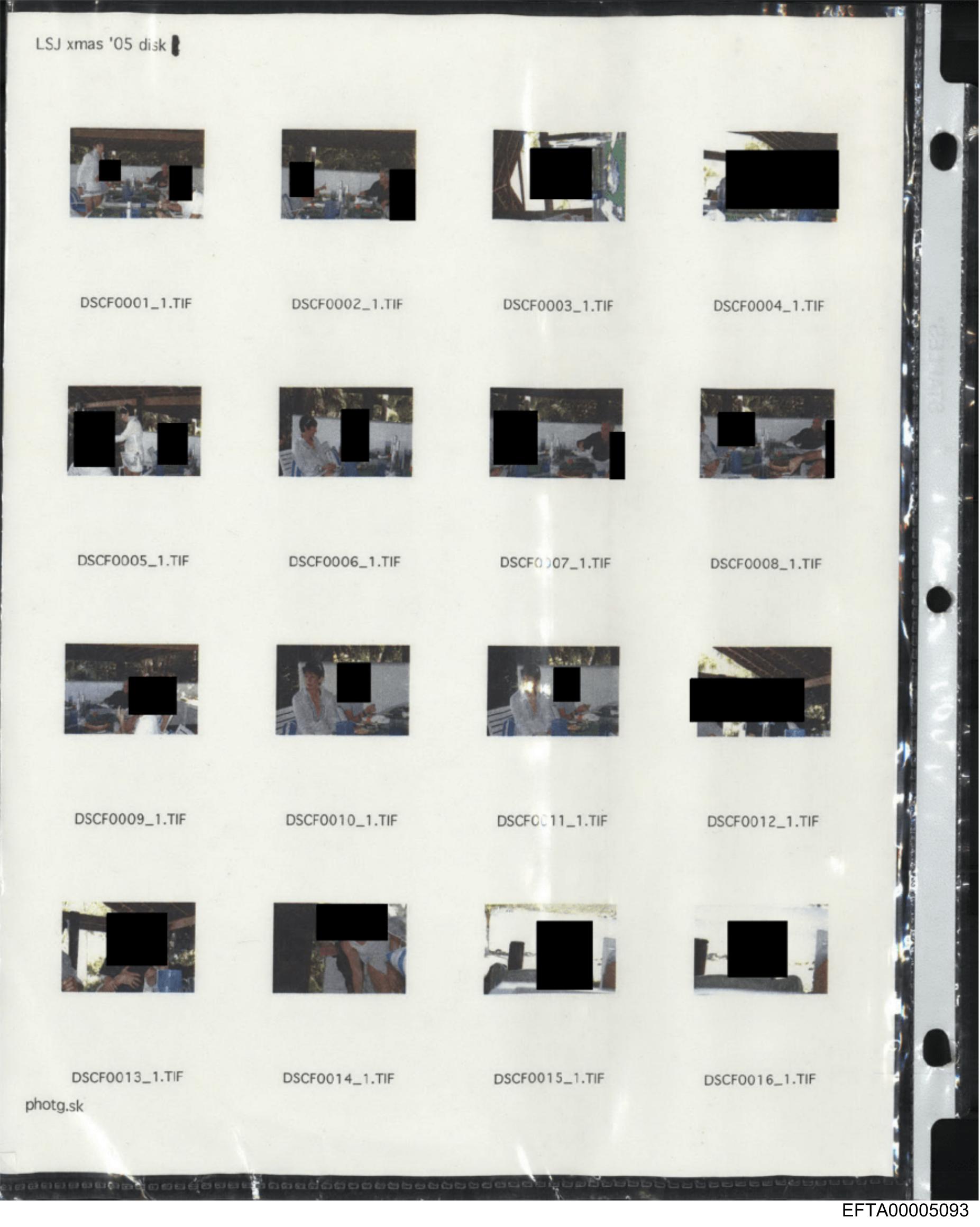 The image shows a collection of photographs laid out on what appears to be a tabletop. The photos are arranged in rows and include various scenes that seem to depict personal moments or events, possibly taken at a party or gathering, as suggested by the context provided in the visible texts. Each photo is accompanied by a black rectangular sticker placed over it, which obscures the central part of each image, preventing viewers from seeing their contents completely. The stickers have writing on them; however, the text is not entirely clear due to the angle and resolution of the photograph. The photos are organized on what looks like a piece of paper with grid lines, indicating an attempt at categorizing or organizing the images in some manner.