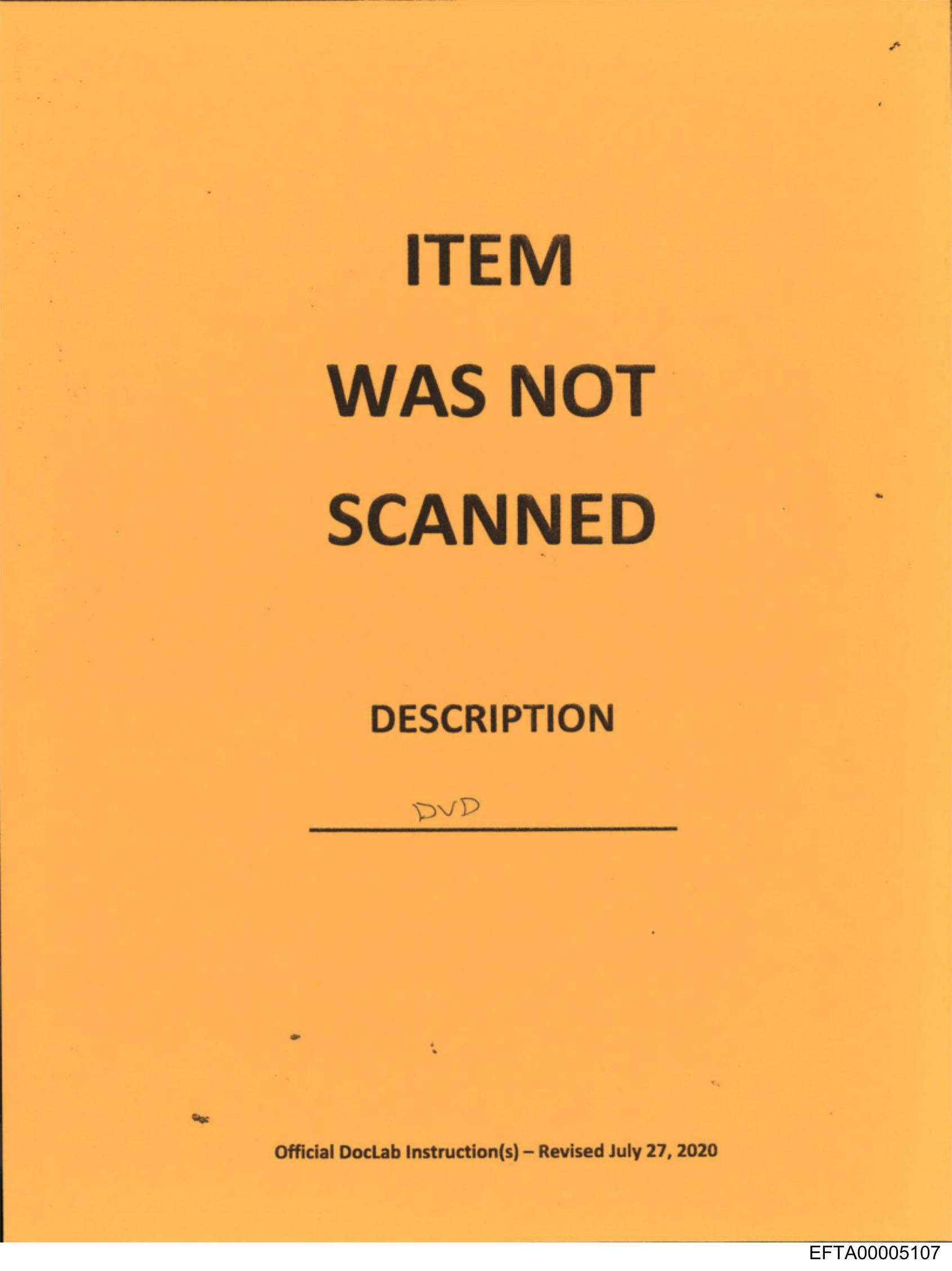 The image shows a yellow piece of paper with black text that reads "ITEM WAS NOT SCANNED" followed by an area labeled as "Description" and another marked as "Official Documentation" at the bottom right corner. There is also some handwritten text, but it's not entirely clear from this angle and resolution. The paper appears to be a notice or instruction sheet.