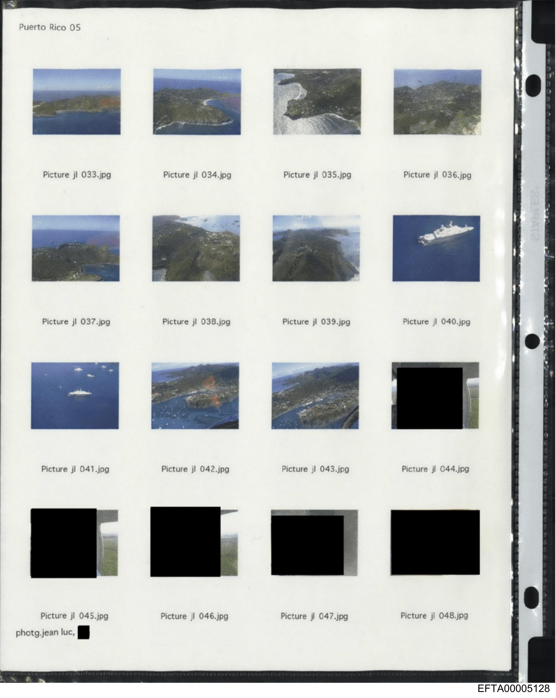 The image displays a collection of photographs placed on a sheet, with each photo outlined individually for organization. The topmost photograph shows an aerial view of a coastal landscape with water and land features. Below it, there are other similar photos depicting various scenes that appear to be from the same location or subject matter. Some of the images have parts blacked out or obscured, possibly indicating sensitive information or areas needing attention. On the right side, there is a watermark or barcode that could be used for identification or tracking purposes.