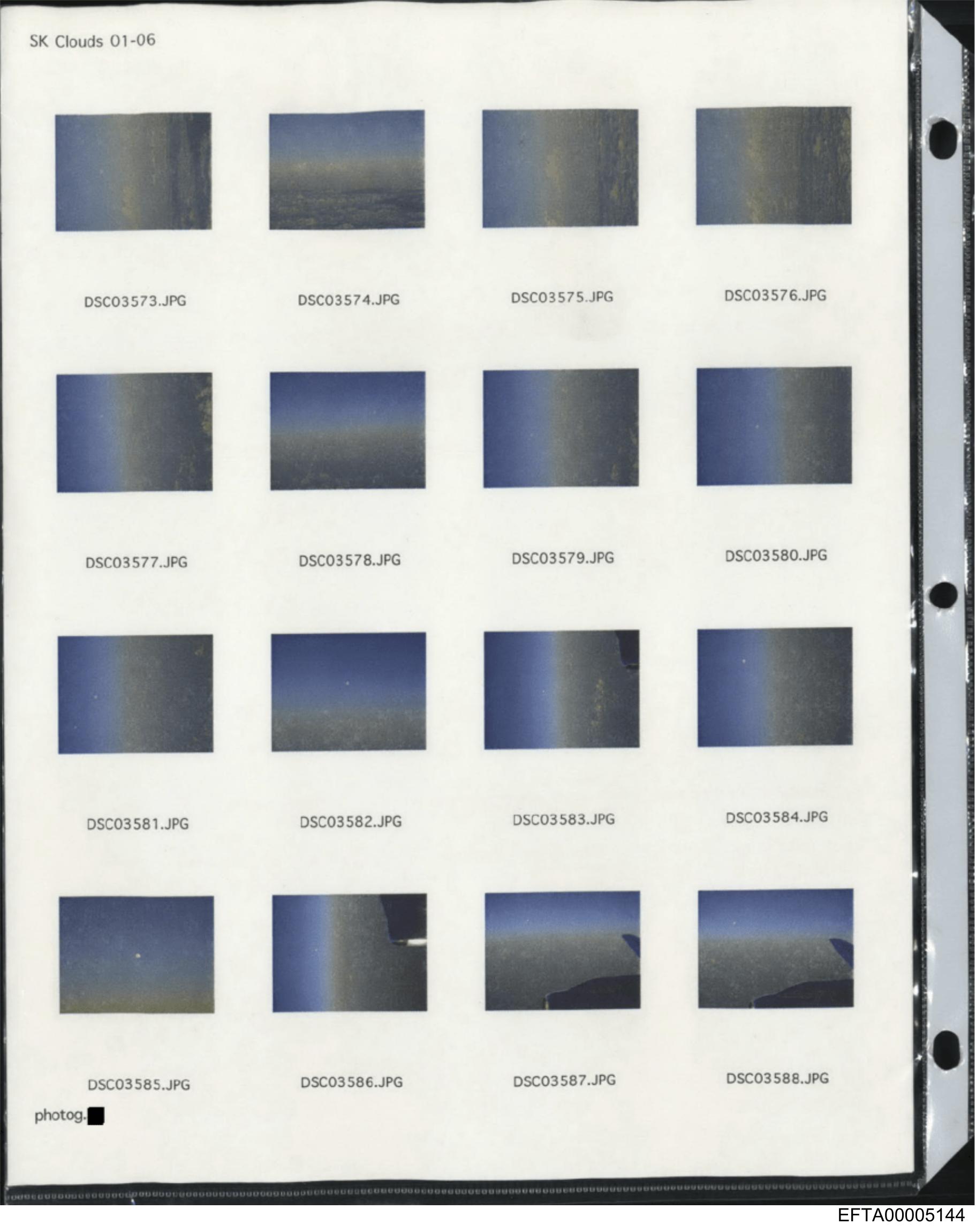 The image is a photograph of a piece of paper with multiple images printed on it. These smaller images are also photographs and show various scenes and subjects, including landscapes, architectural details, and possibly satellite imagery, given their abstract patterns that resemble night-time sky views or radar maps. The text visible in the main photo includes a series of numbers "CHK0402" followed by what appears to be a date "06/01" with several other numbers underneath each image, which might indicate file names, identification codes, or timestamps for the photographs. The paper on which these images are printed is bordered by a thin line and has holes at the top left and bottom right corners, suggesting it could be part of an album, report, or presentation where such pages are typically used to display multiple photographs or illustrations in an organized manner. The style of the image is documentary, capturing a record of various visual content that the paper intends to convey.