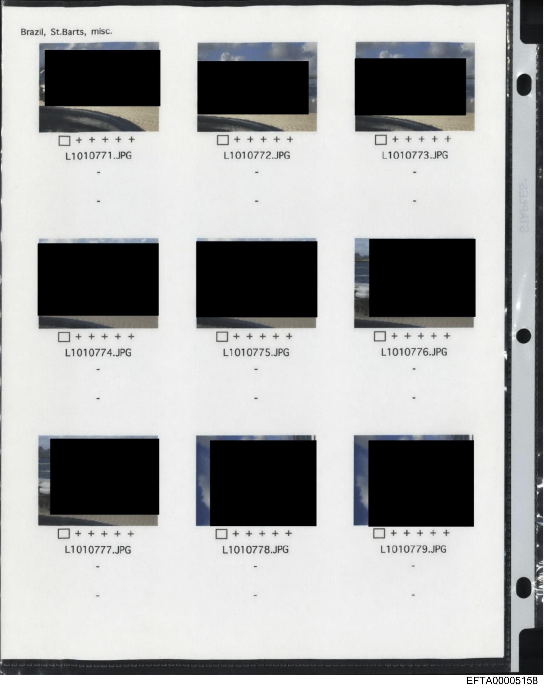 The image shows a set of printed photographs arranged on a white surface with black borders around each photo. The photos are numbered from the bottom to the top and have red x marks over them. Each photograph has an overlaid watermark with text in the upper right corner, indicating some sort of identification or reference number. The style of the image is typical for photographic prints used in a professional or technical context, possibly for review or cataloging purposes. There are no visible texts that reveal any specific content or location within the photographs themselves.