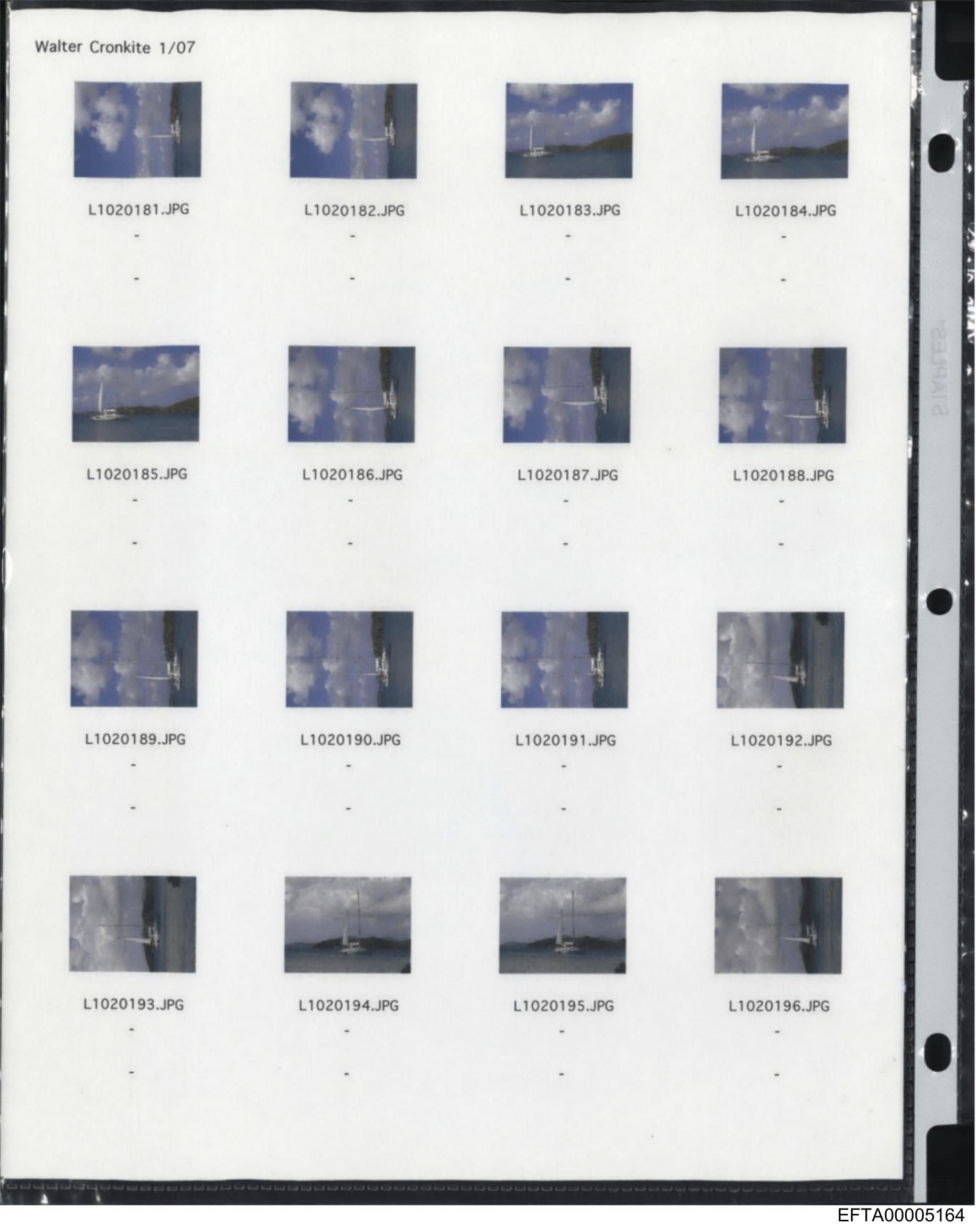 The image is a scanned document, possibly an envelope or package label, with multiple small pictures printed on it. These images depict various maritime scenes, including boats and ships at sea. The surrounding area of the ocean suggests that these photos capture moments in waterside environments, likely coastal areas or harbors. The quality of the scan and the printing on the document suggest it is an older piece of paper with visible creases and wear, indicating it might have been handled or stored for some time before being scanned.