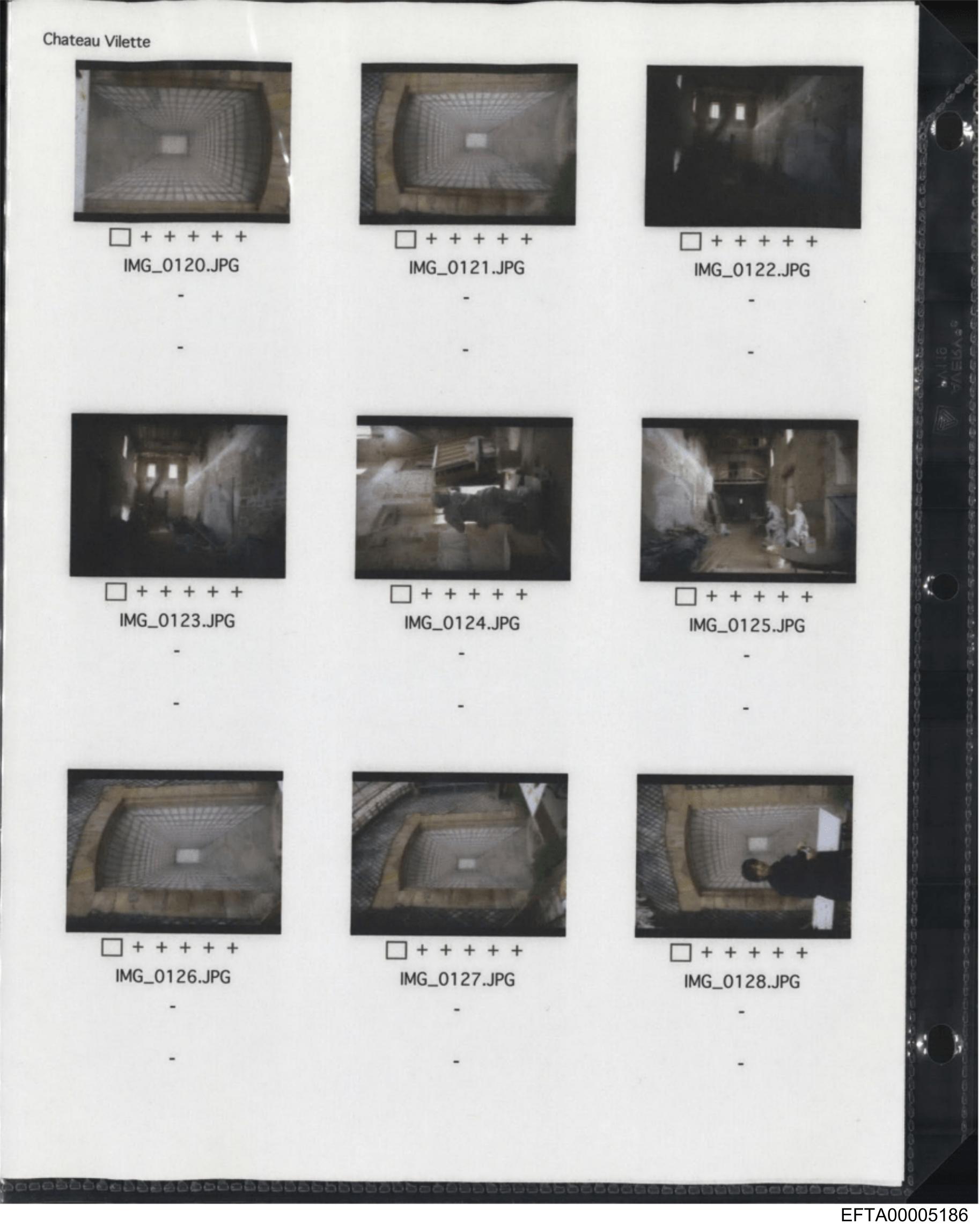 The image shows a strip of film negatives with six frames, arranged vertically, each depicting what appears to be an interior space possibly resembling an attic or loft due to the sloped roofline in most of the frames. The photo captures various angles and lighting conditions within this space, suggesting different moments captured over time or from different perspectives. Each frame has a label that includes text such as "NML01945376" and "NML02005701," which likely correspond to reference numbers for the photographs. The overall style of the image is documentary, with an emphasis on factual representation rather than artistic expression.
