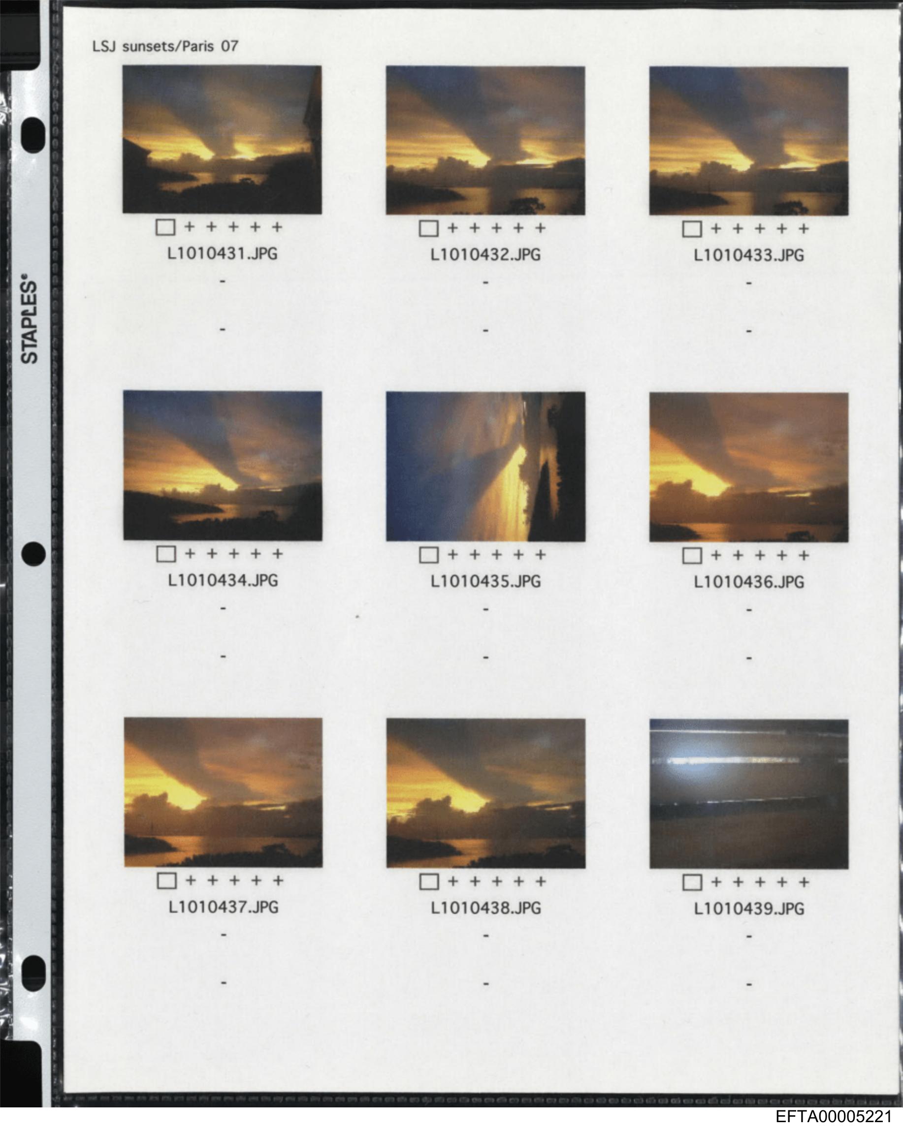 The image appears to be a collection of photographs displayed on a lightbox or similar device. There are eight photos in total, arranged in two columns and four rows. The pictures show a variety of scenes with different lighting conditions, ranging from bright to dark, suggesting they could represent the progression of an event such as sunrise or sunset. Text is visible at the top of each photo's border, likely indicating metadata like the file name or date. The first row features two photos that are significantly brighter than the others, possibly depicting a sky with clouds. Below these, there are three images in a row, each darker than the one above it. The middle row contains two pictures that are relatively similar to the ones above but with less light. There is also an "im_start" watermark at the top left corner of the image, which might be part of a photo album or gallery interface. The bottom right corner shows some sort of marking or code, possibly for cataloging purposes. No people are visible in the photos, and the locations depicted are not identifiable due to the lack of distinctive landmarks or features.